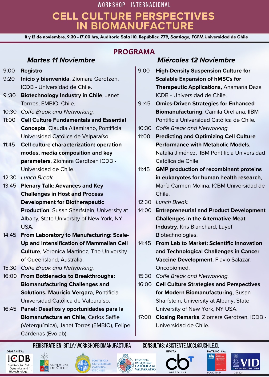 El próximo martes 11 y miércoles 12 de noviembre se llevará cabo un workshop internacional enfocado en biomanufactura con enfoque de cultivo celular. Un balance entre formación y conceptos, perspectiva internacional y discusión de la realidad y avances locales. El taller se desarrollará en dependecias de la FCFM, Av. República 779, Sala i10, FCFM Universidad de Chile.