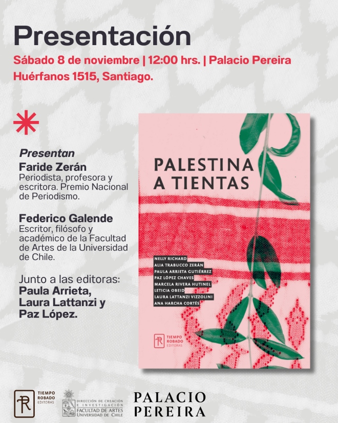 Este sábado 8 de noviembre se presentará “Palestina a tientas”, publicación colectiva editada por las académicas del Departamento de Teoría de las Artes Paula Arrieta, Laura Lattanzi y Paz López, y que reúne además escritos de Nelly Richard, Alia Trabucco, Marcela Rivera, Leticia Obeid y Ana Harcha.