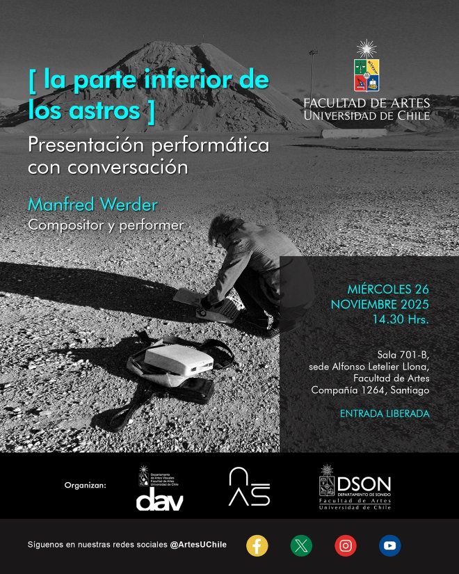 Este miércoles 26 de noviembre, a las 14:30 horas, el destacado compositor y performer, Manfred Werder, realizará la presentación performática con conversación "[ la parte inferior de los astros ]" en la sala 701B de la sede Alfonso Letelier Llona de la Facultad de Artes (Compañía 1264, piso 7, sector B).