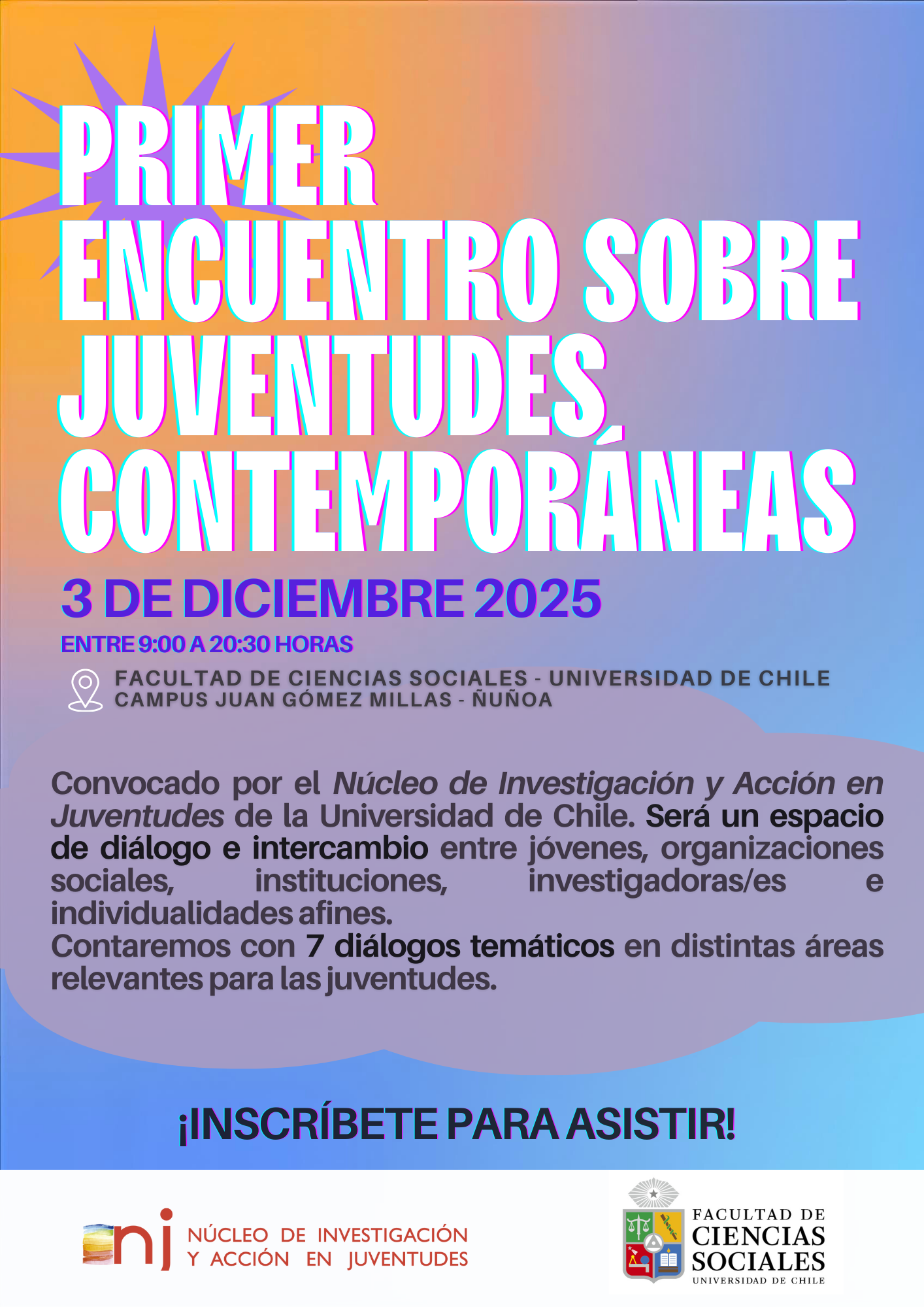 (Campus JGM)El 03 de diciembre 2025, se realizará el Primer Encuentro sobre Juventudes Contemporáneas, desde las 09.00 horas en la Facultad de Ciencias Sociales de la U. de Chile.