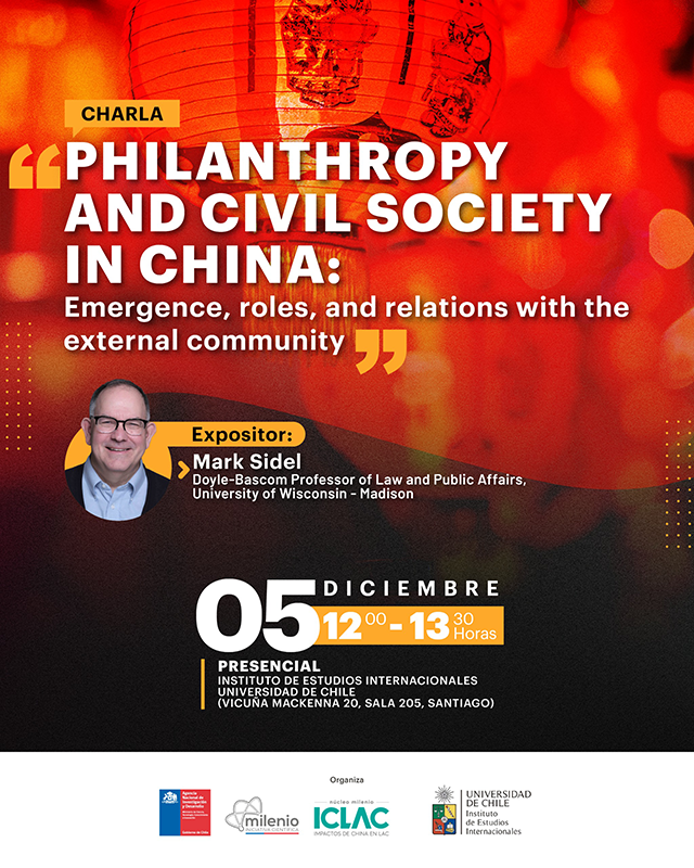 (Vicuña Mackenna 20, Sala 205)El Instituto de Estudios Internacionales de la Universidad de Chile, junto a la Agencia Nacional de Investigación y Desarrollo, a la Iniciativa Milenio e ICLAC, invitan a la charla del académico Mark Sidel, Doyle-Bascom Professor of Law and Public Affairs de la Universidad de Wisconsin.
