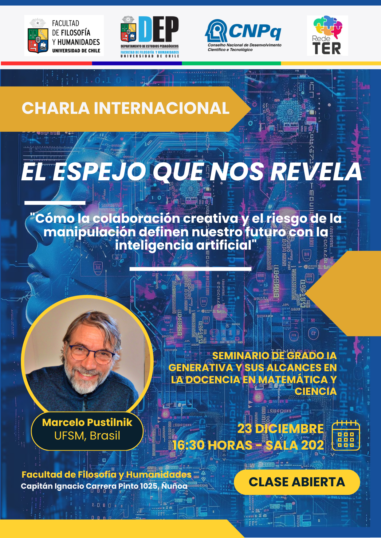 (Avda. Capitán Ignacio Carrera Pinto 1025, Ñuñoa)El Departamento de Estudios Pedagógicos y la Dirección de Relaciones Internacionales, invitan cordialmente a participar en la presentación del Dr. Marcerlo Pustilnik, Universidade Federal de Santa Maria (UFSM) "El espejo que nos revela — Cómo la colaboración creativa y el riesgo de la manipulación definen nuestro futuro con la inteligencia artificial". Esta actividad internacional abierta a todo público se realizará el próximo martes 23 de diciembre a las 16:30 horas con motivo del cierre del Seminario de Grado IA Generativa y sus alcances en la docencia en matemática y ciencias, a cargo de la Prof. Sandra Meza, académica del Departamento de Estudios Pedagógicos.