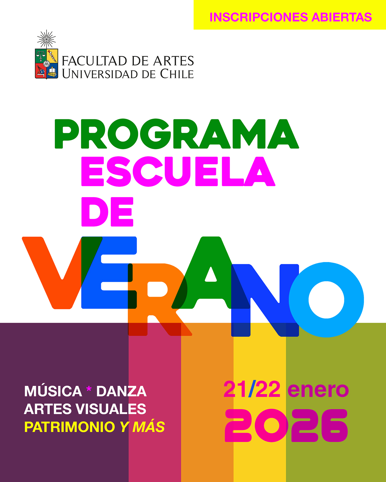 (sedes Pedro de la Barra, Las Encinas, Alfonso Letelier Llona, y Teatro Nacional Chileno y MAPA)El miércoles 21 y jueves 22 de enero, la Facultad de Artes de la Universidad de Chile abre nuevamente sus puertas para invitar a la segunda versión de su Escuela de Verano, una iniciativa que busca acercar el arte a la ciudadanía a través de talleres y recorridos preparados por las diferentes unidades de la Facultad, de la mano de destacadas/os artistas de nuestra comunidad y entregando, además, la oportunidad de conocer las dependencias de la Facultad de Artes, específicamente las sedes Alfonso letelier Llona, Pedro de la Barra y Las Encinas, así como el Teatro Nacional Chileno y el Museo de Arte Popular Americano.
