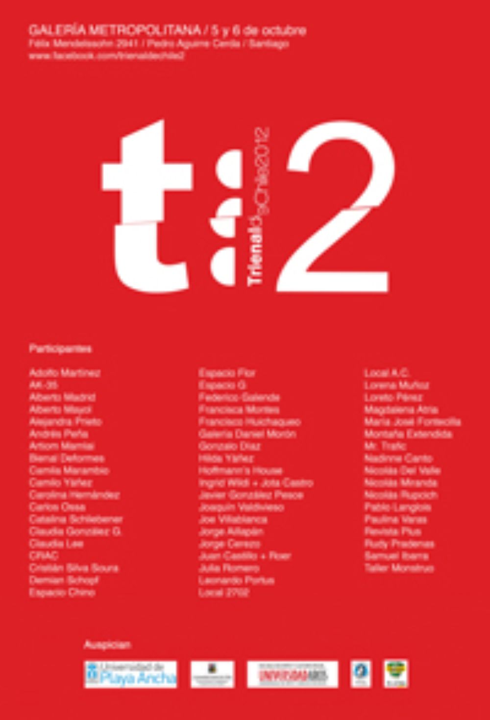 TRIENAL DE CHILE 2 es una reflexión visual y teórica sobre la situación actual del arte contemporáneo en Chile, a partir de la recuperación crítica de este evento organizado por el Estado (a través de la Fundación Trienal y el Consejo Nacional de la Cultura) en 2009, y que no tendrá continuidad institucional en 2012. Este ejercicio analítico considerará también múltiples fenómenos que dan cuenta de la expansión y sofisticación de la lógica de mercado, que ha traído consigo efectos problemáticos para el sistema de arte local que se manifiestan en una domesticación y desactivación crítica de la escena. Entre estos efectos podemos destacar: la multiplicación de escuelas de arte, la proyección de "lo ferial" como único recurso para propiciar el desarrollo y proyección de la escena chilena, y la instalación del concepto de industrias creativas que apuntan a una política de "empresarización" de la cultura que ha venido a problematizar ideas tales como "espacio alternativo" y "autogestión". Finalmente, una crítica al papel que el Estado chileno actual está cumpliendo en materia de apoyo al arte contemporáneo, que se basa fundamentalmente en un alineamiento con proyectos comerciales, dejando de lado el papel que principalmente debiera corresponderle: apoyo a prácticas artísticas experimentales, investigativas, sin fin de lucro, que apuntan a transformaciones estéticas y/o culturales. Por lo tanto, las preguntas iniciales para desencadenar un debate serían ¿dejarse llevar por el seductor perfume del mercado o reconstruir una política alterna de resistencia? ¿Qué hacer?