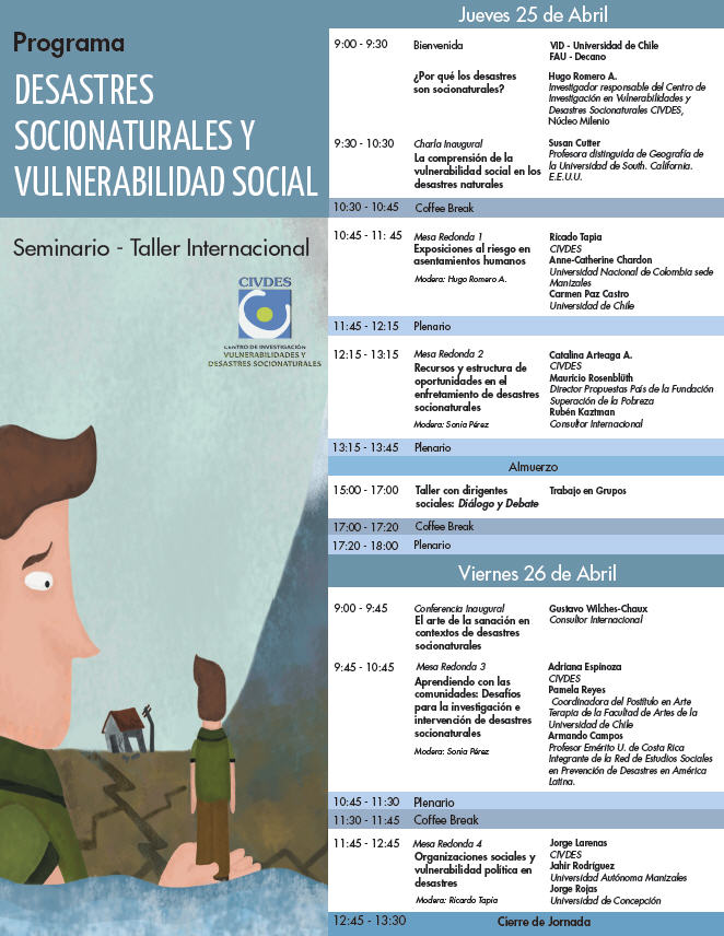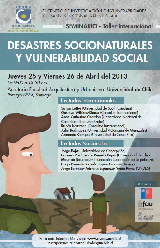 (Portugal 84, Santiago, Chile)El Centro de Investigación en Vulnerabilidades y Desastres Socionaturales - CIVDES- de la Facultad de Ciencias Sociales de la Universidad de Chile y la Iniciativa Científica Milenio, invitan a un espacio de debate social y académico de alto nivel científico internacional que aportará a las orientaciones políticas en el área de los desastre socio-naturales. Geógrafos, psicólogos sociales y abogados, entre otros profesionales de países como Estados Unidos, Colombia y Chile, expondrán durante dos días investigaciones y estudios de experiencias que han buscado mejorar la calidad de vida de las personas luego de grandes tragedias naturales.