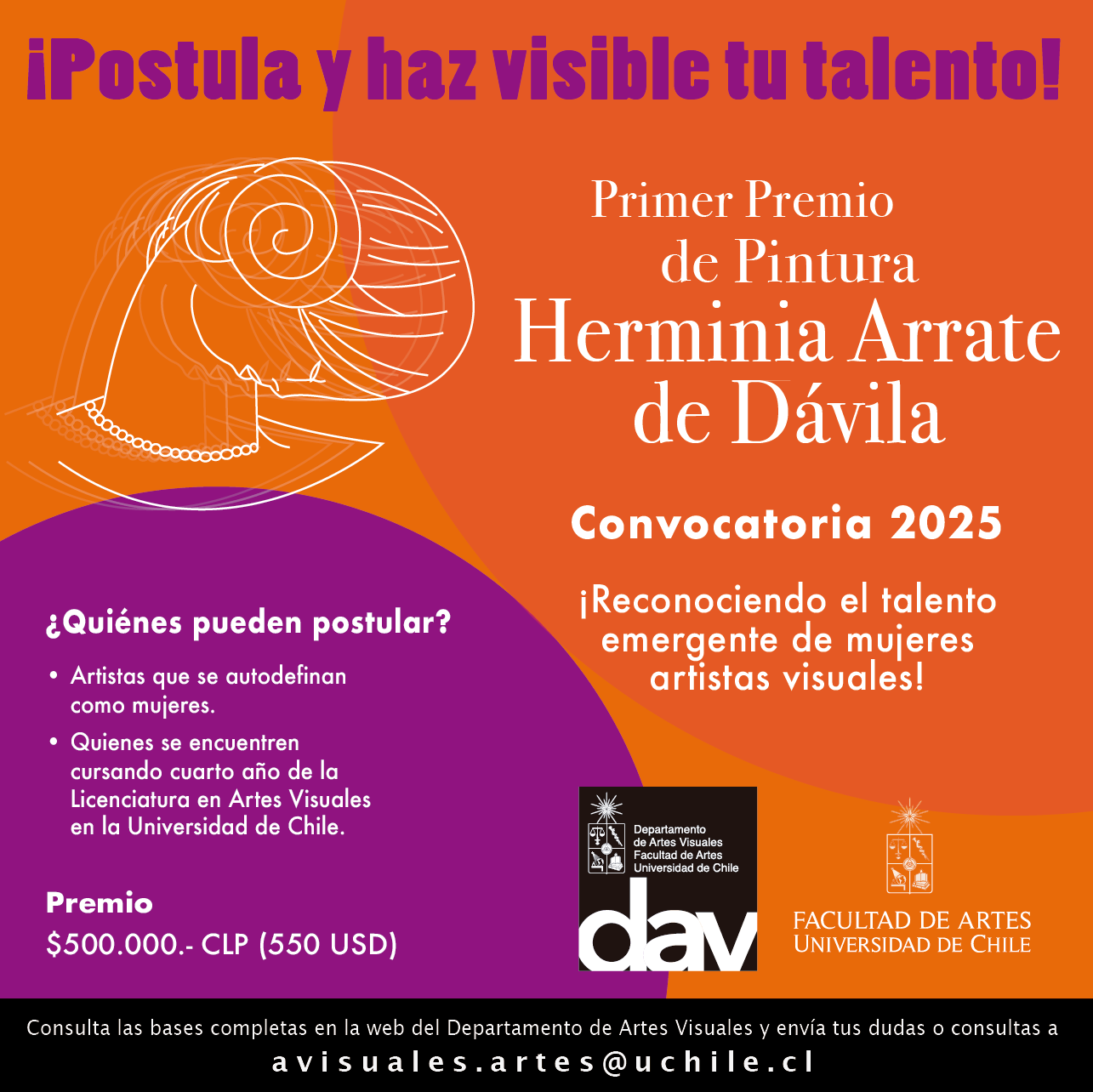 El Premio Herminia Arrate de Dávila, financiado por la Familia Carrasco-Dávila, busca reconocer y promover el talento emergente de mujeres en el campo de las artes visuales. Este galardón está dirigido a estudiantes de cuarto año de la Licenciatura en Artes, mención Artes Visuales, o quienes hayan cursado este nivel anteriormente y estén por egresar durante el año en curso.