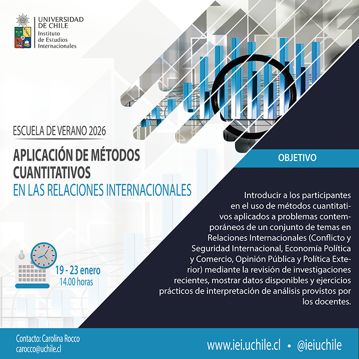 Introducir a los participantes en el uso de métodos cuantitativos aplicados a problemas contemporáneos de un conjunto de temas en Relaciones Internacionales (Conflicto y Seguridad Internacional, Economía Política y Comercio, Opinión Pública y Política Exterior) mediante la revisión de investigaciones recientes, mostrar datos disponibles y ejercicios prácticos de interpretación de análisis provistos por los docentes.