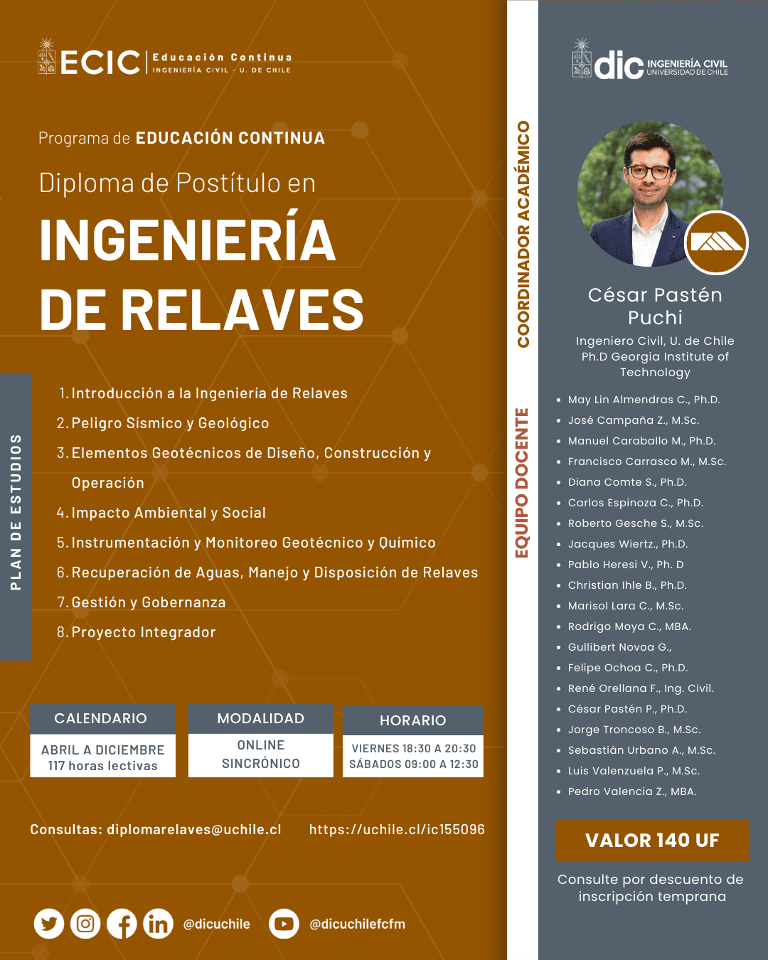 Este programa multidisciplinario ha formado más de 140 profesionales chilenos y extranjeros en sus cuatro versiones desde 2019. Se concibe como una iniciativa que focaliza la experiencia de destacados académicos y profesionales en ingeniería de relaves para acelerar el proceso de formación de capital humano avanzado, centrando su ámbito formativo en la implementación de las mejores prácticas y tendencias de la industria minera. Este diploma se dicta anualmente desde 2025.