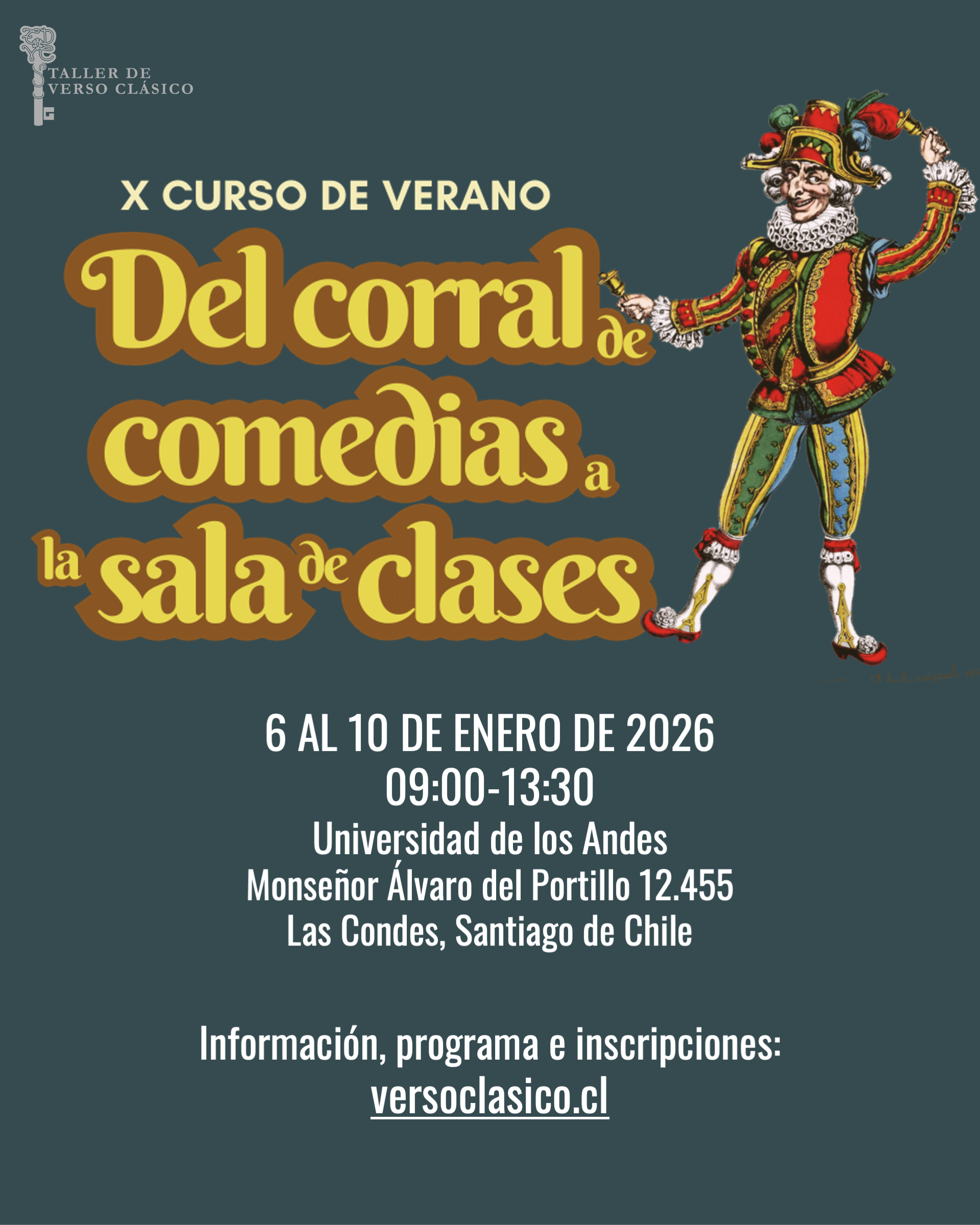 Como dice el título, el curso está dirigido a profesores y estudiantes de Lenguaje y Literatura y directores de teatro escolar, pero estamos abiertos a enseñar también a profesores de educación básica y media, profesores universitarios, actores y directores de teatro, bibliotecarios, gestores culturales, estudiantes de pedagogía, idiomas, lengua o literatura. El sentido de este curso es que los asistentes transmitan este conocimiento a otras personas (idealmente, sus estudiantes) y así puedan participar como actores o directores en el X Festival de Verso Clásico (octubre 2026) en cualquiera de sus tres categorías: interpretación de poemas, monólogo, escena teatral.