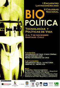 "Biopolítica. Tecnologías y Políticas sobre la Vida" es el nombre del próximo encuentro internacional sobre estudios de biopolítica que se desarollará en Santiago de Chile, el próximo 4, 5, 6 y 7 de noviembre de 2008.