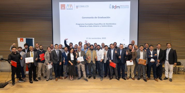 El Departamento de Ingeniería de Minas de la Universidad de Chile y la Corporación Nacional del Cobre (Codelco) realizaron la ceremonia de graduación del Programa Formativo Específico de Geotecnia, impartido entre octubre de 2024 y noviembre de 2025. Esta iniciativa estuvo orientada a fortalecer las competencias técnicas de profesionales vinculados a esta área estratégica para la minería.
