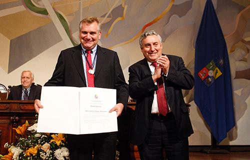 Así, en el marco de la ceremonia oficial del 173 aniversario de su fundación, la Universidad de Chile, a través de su Rector, el Dr. Ennio Vivaldi Véjar, les hizo entrega de la “Medalla Rectoral” como homenaje de la comunidad universitaria.