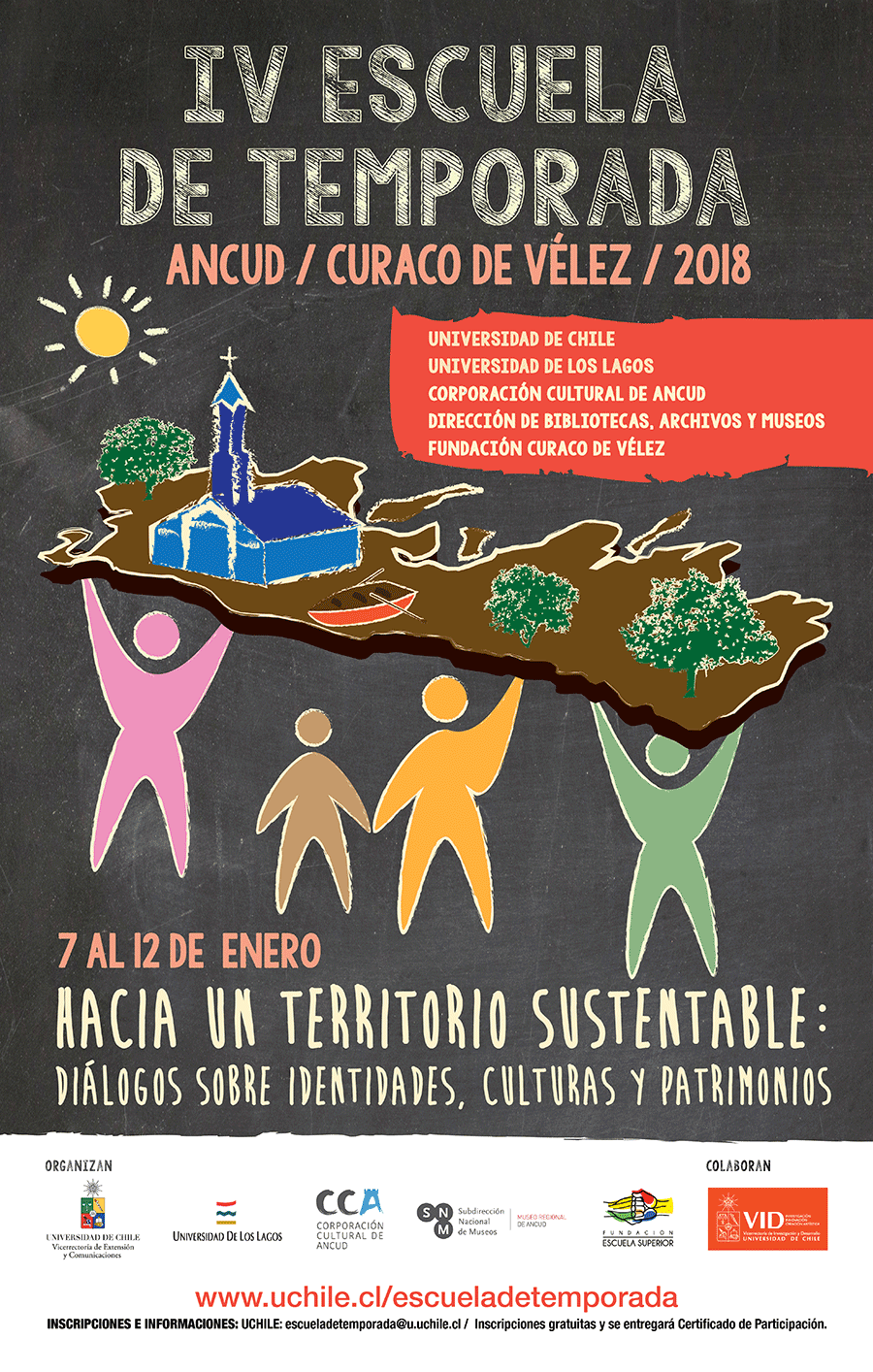 Para el caso de los talleres y diálogos, cuya descripción, fechas y horarios se encuentran disponibles en el sitio web www.uchile.cl/escueladetemporada, es preciso que los interesados puedan inscribirse en dicha plataforma y en los formularios disponibles en papel en la sede de la Universidad de Los Lagos (Ramírez #348), y en la Casa de la Cultura de Ancud (Libertad #663), dado que los cupos son limitados en el caso de los talleres.