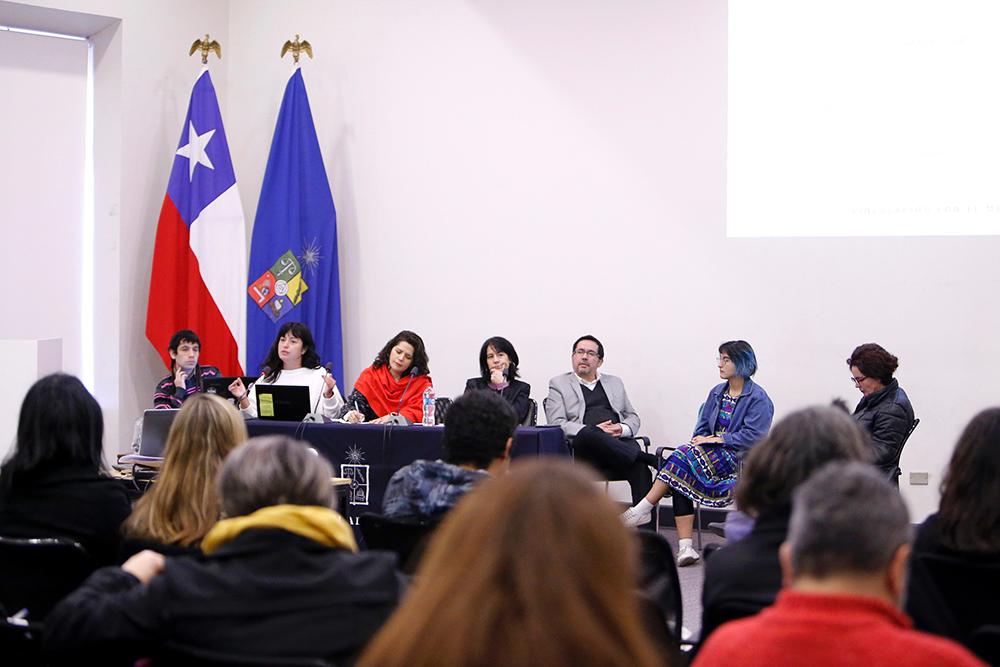 De la primera mesa de conversación, moderada por Ximena Póo, participaron María de los Ángeles Cornejos, directora de Extensión de la Facultad de Artes; Verónica Pizarro, directora de la Escuela de Sistemas de Información y Auditoría de la Facultad de Economía y Negocios; Viviana Sobrero, jefa de Gestión de la Formación del Departamento de Pregrado; Luis Vargas, director de Vinculación Externa de la Facultad de Ciencias Físicas y Matemáticas; y los estudiantes Katherine Leyton y Kevin Valenzuela de la Secretaria de Extensión y Trabajos Voluntarios de la Federación de Estudiantes de la Universidad de Chile (FECH).