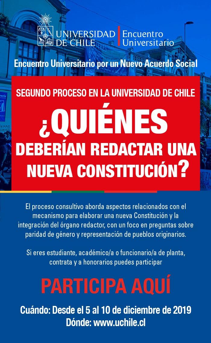 Bajo la premisa de ejercer y aplicar los principios de la democracia y el pluralismo, la Casa de Bello convoca nuevamente a su comunidad -estudiantes, académicos y académicas y funcionarios y funcionarias de planta, contrata y a honorarios- a participar de un proceso consultivo referido al mecanismo para elaborar una nueva constitución y la integración del órgano redactor de la carta fundamental, con un foco en preguntas sobre paridad de género y representación de pueblos originarios.