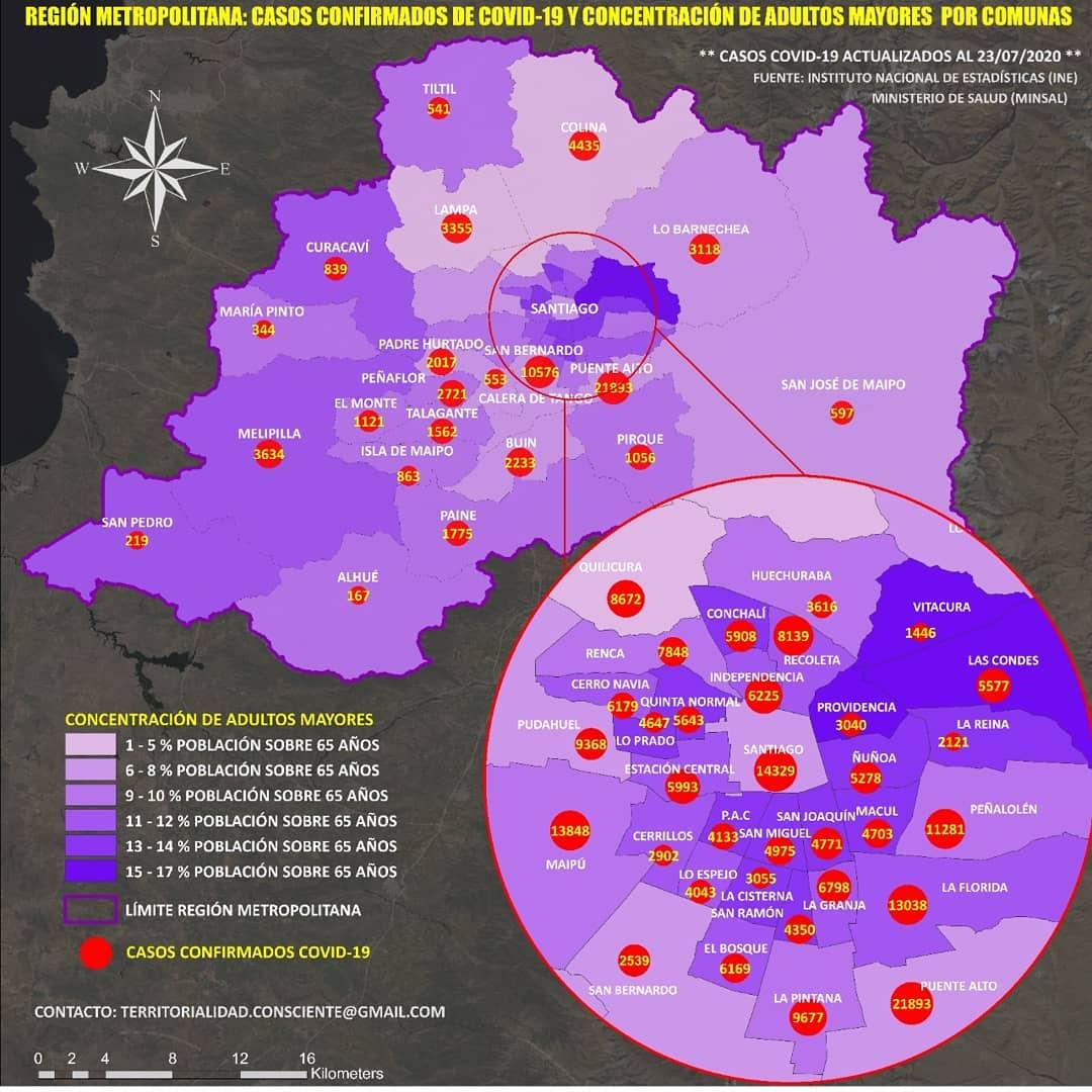 “Dentro del trabajo que hemos realizado hasta ahora se pueden encontrar cartografías que visibilizan las concentraciones de población perteneciente a la tercera edad (grupo de riesgo) y los casos confirmados de COVID-19 en las comunas de la Región Metropolitana”, agregó Karen Ibarra, señalando, además, que están frecuentemente incorporando información de nuevas comunas.
