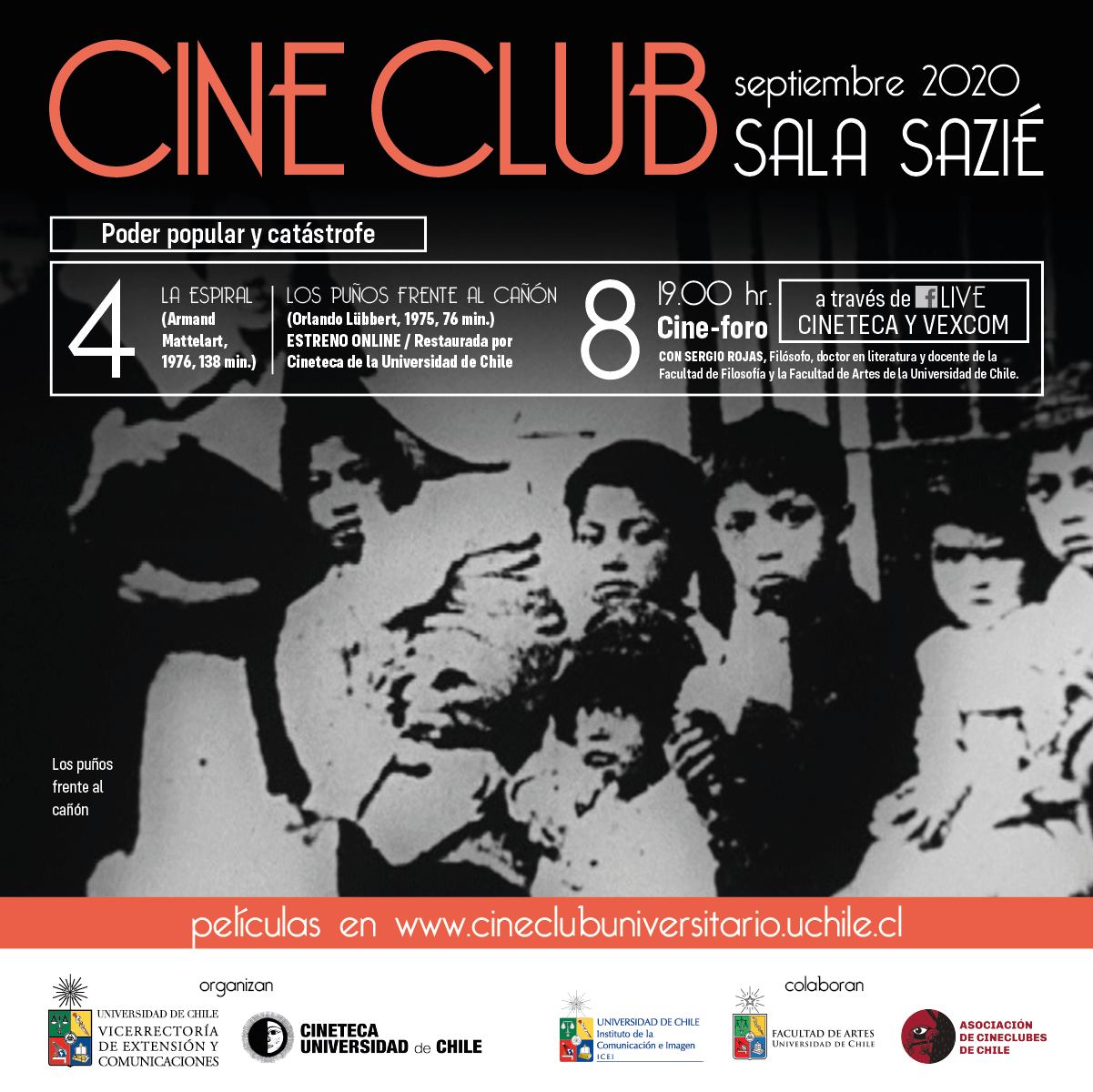 Ahora, en el marco de la conmemoración por los 50 años del triunfo de Salvador Allende, la película está ahora disponible en el sitio web del cineclub y será protagonista este martes 8, a las 18 horas, de la segunda edición virtual del foro Cineclub Sala Sazié, donde será analizada por Sergio Rojas, filósofo, doctor en literatura y docente de la Facultad de Filosofía y la Facultad de Artes de la Universidad de Chile. En la actividad que será transmitida por el Facebook live de la Vicerrectoría de Extensión y Comunicaciones (@VEXCOUchile), se comentará también el documental La espiral (1976), del sociólogo belga Arman Mattelart, quien registró y analiza cómo el gobierno de Allende sufrió el bloqueo constante de la derecha y la intervención de EEUU hasta terminar en su derrocamiento.