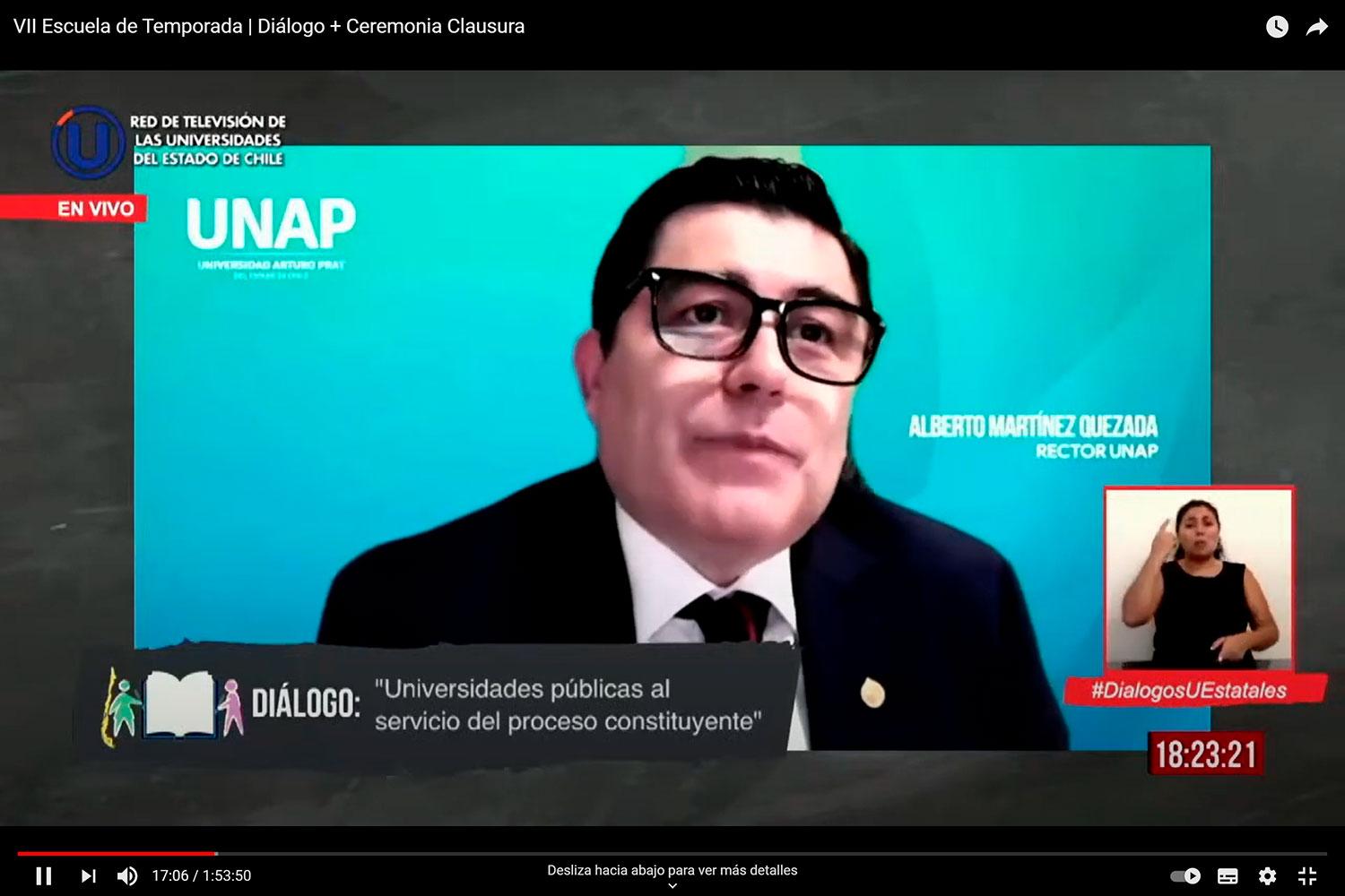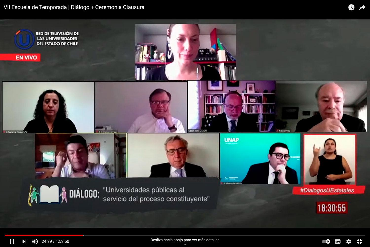 El rol de las universidades del Estado en el actual proceso constituyente y el papel de la vinculación con el medio y la extensión universitaria en este contexto. Estos fueron los ejes del diálogo que el viernes pasado entablaron las máximas autoridades de ocho universidades estatales del país en el marco del cierre de la VII Escuela de Temporada de la Universidad de Chile. La actividad, organizada por la Vicerrectoría de Extensión y Comunicaciones, este año se realizó de forma inédita en modalidad virtual y en colaboración con estos planteles para generar un diálogo a través del territorio que unió a la academia y la sociedad civil.