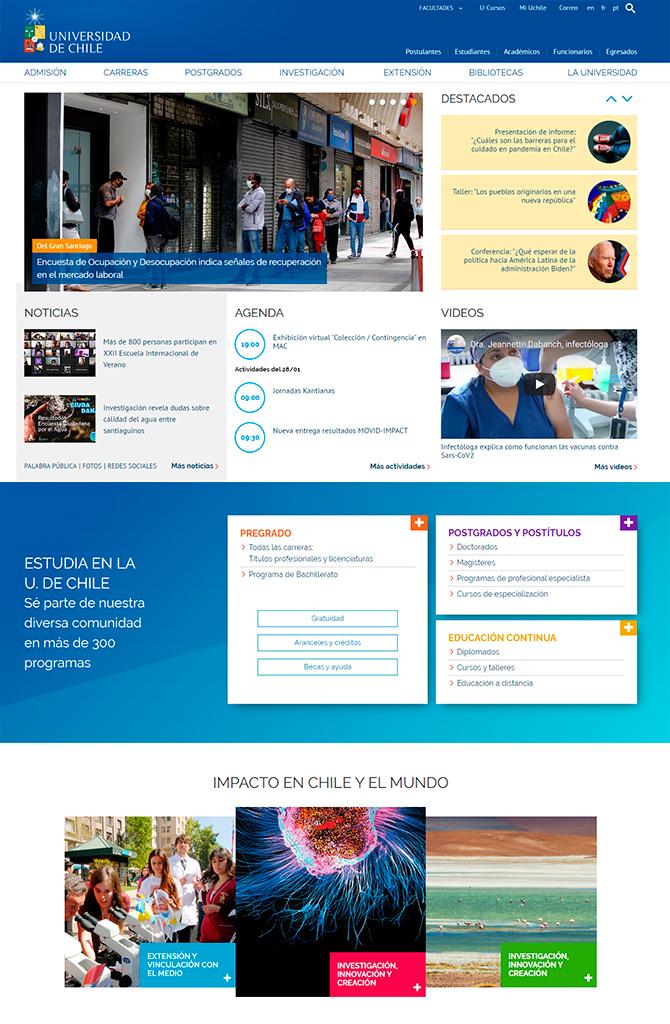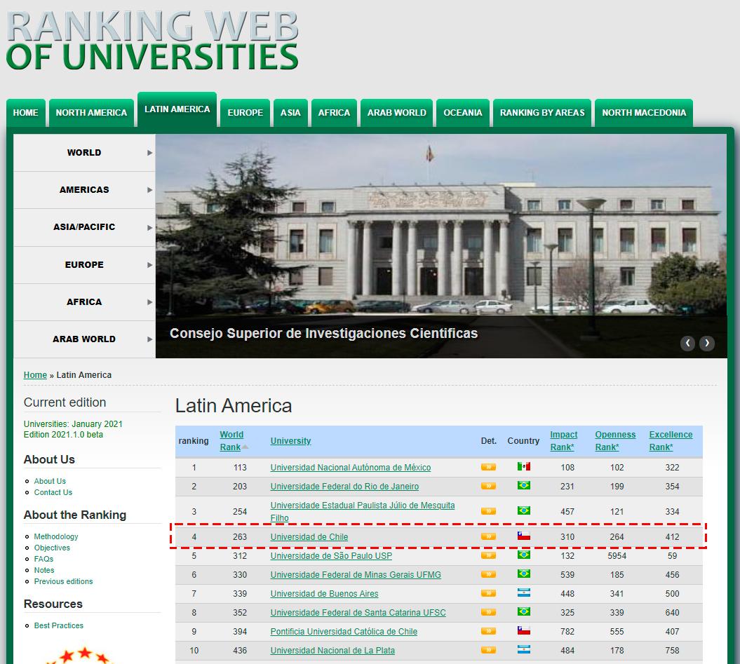 Un alza de 41 lugares experimentó la Universidad de Chile y sus portales web en la medición de enero del Ranking Web de Universidades, pasando desde el puesto 304 -registrado en julio de 2020- al 263. Con esta ubicación se mantiene como primera en Chile y se ubica cuarta en Latinoamérica, sólo superada por la Universidad Autónoma de México, la Universidade Federal do Rio de Janeiro y la Universidade Estadual Paulista Júlio de Mesquita Filho.