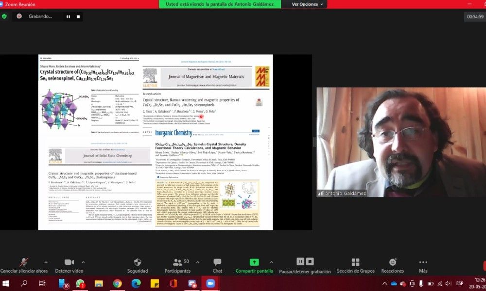Esta charla estuvo dirigida a los académicos del Departamento de Química de la UCN y a estudiantes de sus respectivas carreras. Su contenido se enfocó principalmente en presentar las líneas de investigación del grupo de Química del Estado Sólido y Cristalografía que son materiales termoeléctricos, absorbentes para celdas solares tipo CZTS y Magnetoquímica de Sulfo- y Seleno-espinelas. Además, durante la exposición del Dr. Galdámez se presentaron actividades didácticas del Concurso de Crecimiento de Cristales de la Asociación Chilena de Cristalografía (AChCr), junto con la descripción estructural de algunos minerales chilenos.