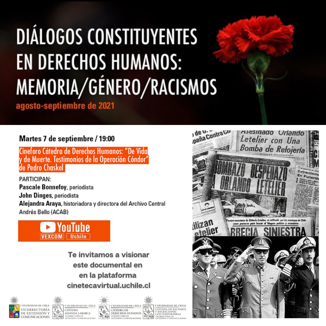 En tanto, el martes 7 de septiembre a las 19 horas, se realizará el conversatorio en torno a “De Vida y de Muerte. Testimonios de la Operación Cóndor” (2015) del cineasta y montajista Pedro Chaskel, que indaga en uno de los episodios más dramáticos de la historia de Chile y de América Latina a través de los documentos desclasificados de la dictadura paraguaya del general Stroessner, que se conocen como los Archivos del Horror, donde se revelan responsables y detalles de la acción concertada de las dictaduras latinoamericanas de los años ’70 y ’80 para perseguir y reprimir a sus opositores.