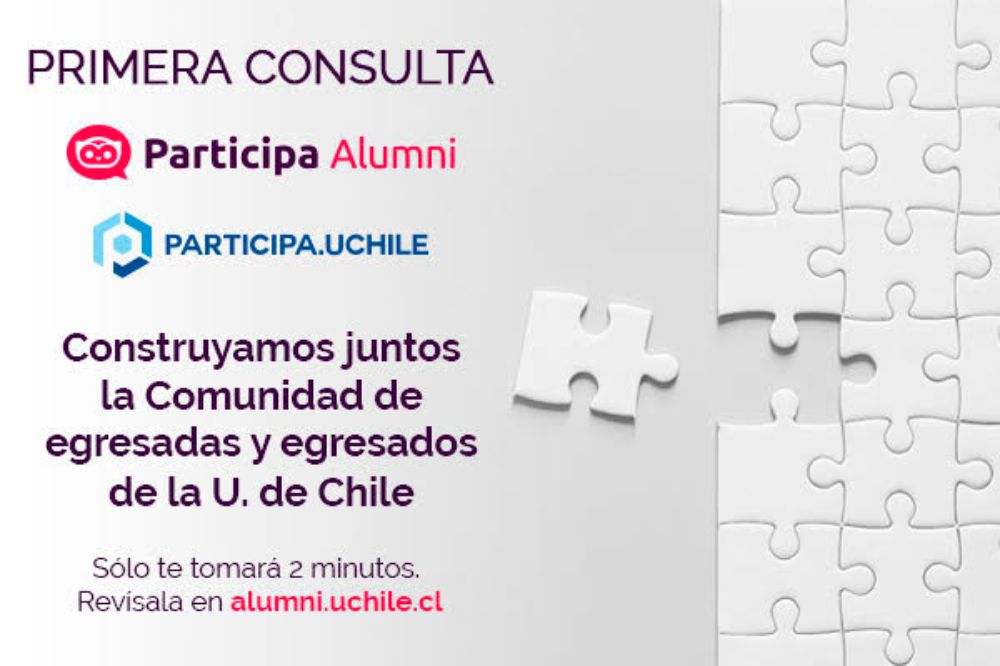 Este lunes 25 de abril comenzó la consulta “Participa Alumni: reconéctate con la U”, la primera encuesta electrónica masiva dirigida a la comunidad de egresadas y egresados de la Universidad de Chile que ya están inscritos en el sitio web de Alumni (alumni.uchile.cl).