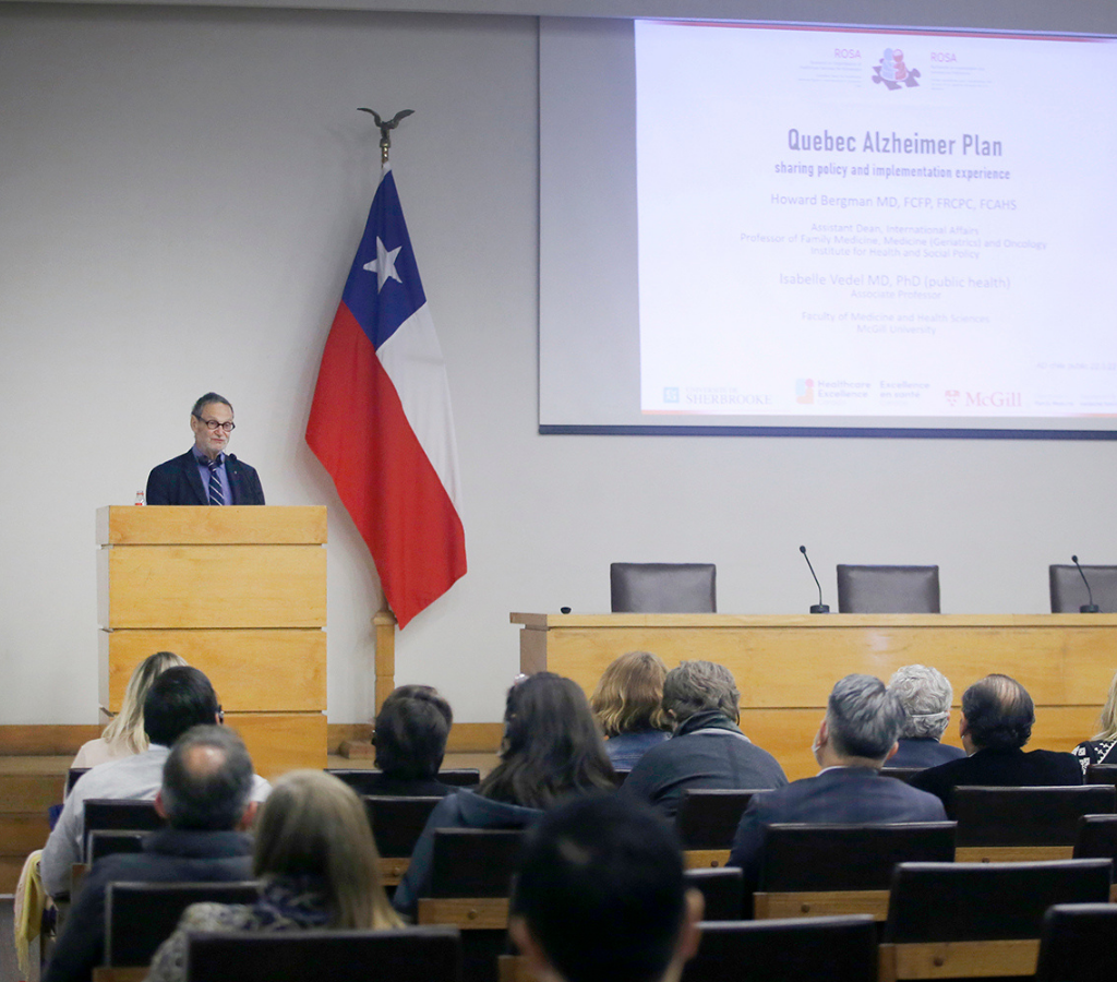 El encuentro contó la participación de Isabel Vedel, Doctora de salud pública y profesora asociada en el Departamento de Medicina Familiar de la Universidad McGill, especialista en atención primaria, y enfermedades crónicas como Alzheimer y otras patologías relacionadas con las personas mayores; junto a Howard Bergman, académico del departamento de Medicina Familiar, Medicina y Oncología en el McGill Institute for Health and Social Policy, y experto en temas de envejecimiento, demencia, cuidados primarios y política pública.