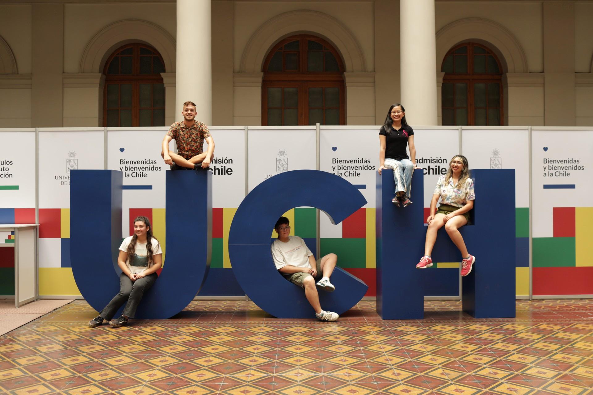 Cinco estudiantes, dos mujeres y tres hombres, posan sentados arriba del volumétrico de las letras UCH, instalado en Casa Central para el proceso de matrícula.