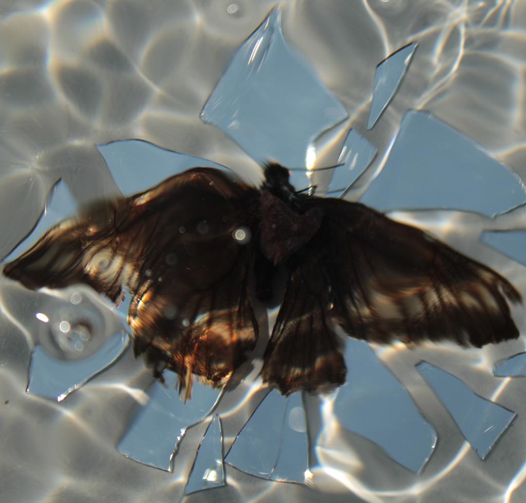 Así, llegaron a la portada final correspondiente a una fotografía digital (sin edición posterior) de estos vidrios sumergidos bajo el agua, en donde también resalta una mariposa disecada en el centro. “Lo que vemos son los objetos sumergidos con una vista frontal que resalta los reflejos y movimientos del agua, logrando distorsionar a través de ella los elementos”.