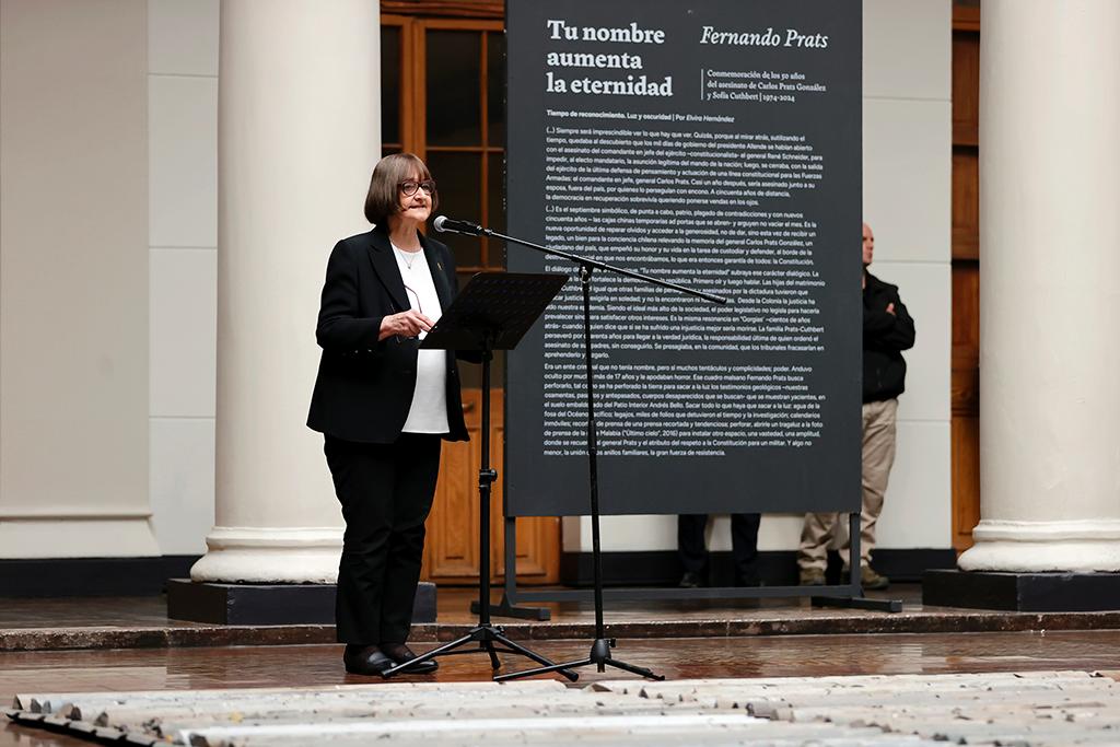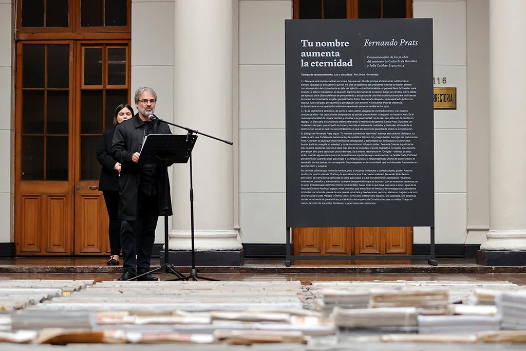 Familiares, amigos y representantes del mundo cultural, político y de las organizaciones de DDHH, participaron este martes 3 de septiembre de la inauguración de la muestra “Tu nombre aumenta la eternidad”, del artista Fernando Prats. Presidida por la Rectora de la U. de Chile, profesora Rosa Devés, la apertura de la instalación en el Patio Andrés Bello contó con la presencia de la ministra de Defensa Nacional, Maya Fernández Allende; del presidente del directorio de Codelco, Máximo Pacheco; de a presidenta de la Agrupación de Ejecutados Políticos y Medalla Derechos Humanos y Democracia 2023, Alicia Lira; entre otras y otros invitados especiales.