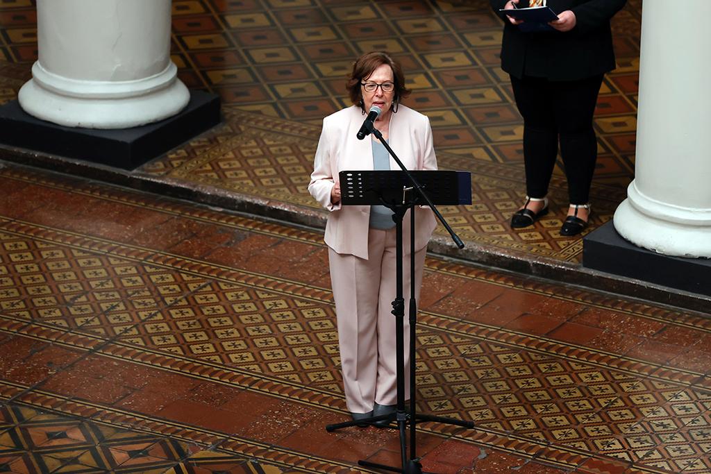Participaron de esta ceremonia la Rectora Rosa Devés; la ministra de Defensa, Maya Fernández; las y los vicerrectores de Investigación y Desarrollo, Christian González-Billault, de Extensión y Comunicaciones, Pilar Barba; de Asuntos Estudiantiles y Comunitarios, Josiane Bonnefoy; el presidente del directorio de Codelco, Máximo Pacheco; familiares de Carlos Prats y Sofía Cuthbert, entre ellas sus hijas Angélica, Sofía y Cecilia; el alcalde de Huechuraba, Carlos Cuadrado Prats; la medalla Derechos Humanos y Democracia 2023, Alicia Lira; la medalla Derechos Humanos y Democracia 2024, Cecilia Medina; la Premio Nacional de Artes Plásticas 2023, Cecilia Vicuña; integrantes del cuerpo diplomático, del Consejo y Senado Universitario y del Consejo de Evaluación, entre otras y otros invitados especiales.