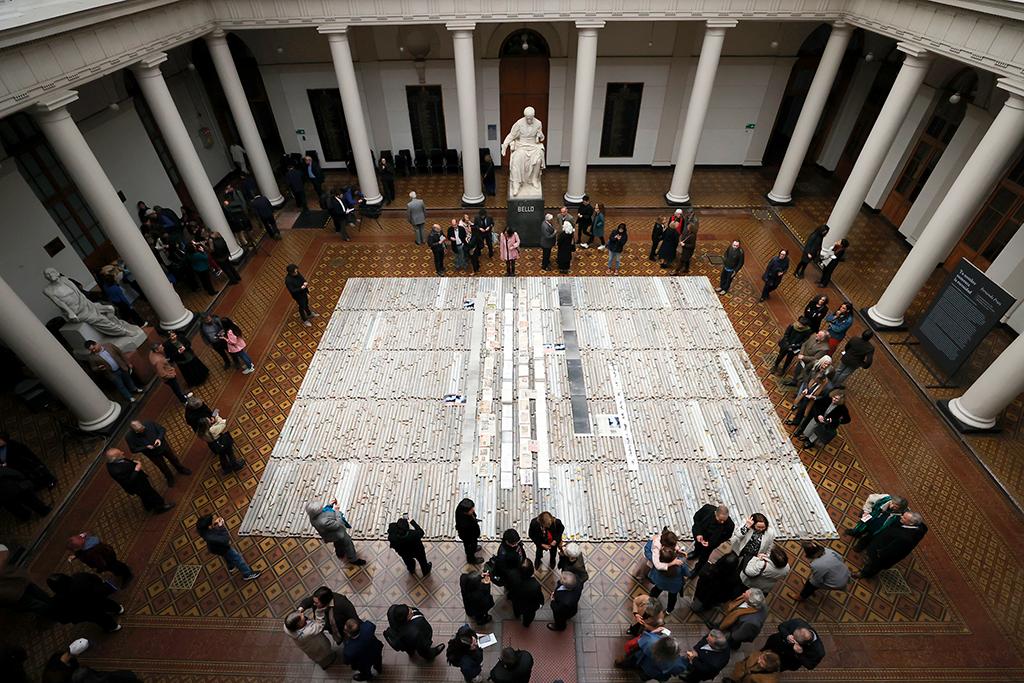 Los certificados de nacimiento, junto a los archivos y otras obras de Prats, serán dispuestos, a modo de tierra arada, sobre los testigos geológicos, que expresan el intercambio de los dolores frente al horror de las víctimas. De esta manera, el suelo del Patio Andrés Bello evoca la memoria inserta en el territorio chileno, un paisaje que contiene el dolor y que al mismo tiempo es de una belleza inconmensurable. Es en esta contradicción donde se produce la fractura de la tragedia.