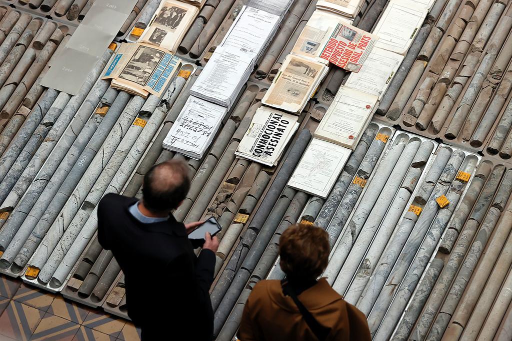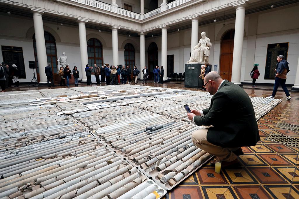 La instalación ocupa la totalidad del Patio Andrés Bello, donde se dispuso de un centenar de testigos geológicos y una serie de documentos investigativos y de prensa del proceso judicial de la época. Estos primeros recursos materiales fueron traídos desde la División Andina de Codelco en la Cordillera de los Andes, y dan cuenta del registro de más de 900 metros de profundidad. “Extraer desde las profundidades esta piedra y obtener este registro es pensar en el tiempo geológico de nuestro territorio, sus sedimentos, capas y memoria. El tiempo de una -y varias- tragedias y de la resistencia; el tiempo del dónde están y el nunca más. El territorio como un primer testigo de nuestro pasado, presente y futuro”, detalló Fernando Prats.