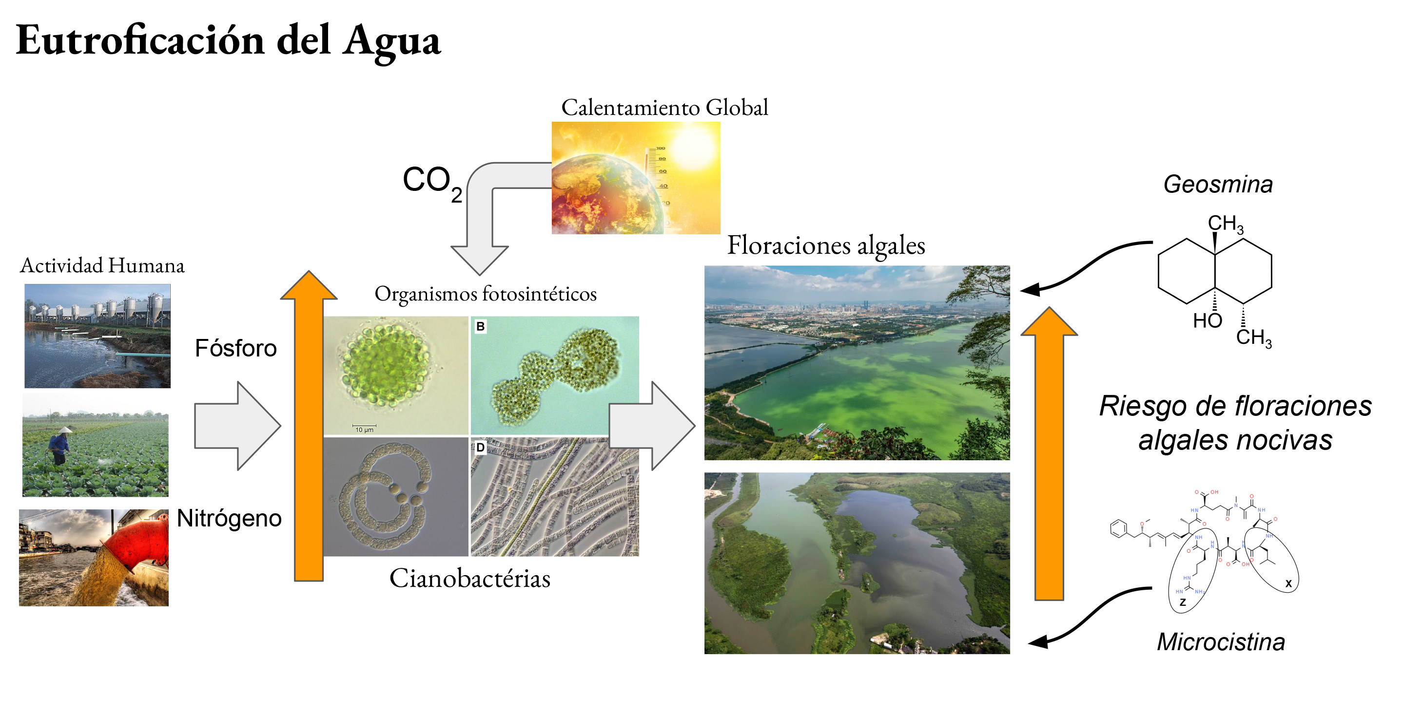 El impacto irreversible de la emisión de gases de efecto invernadero, especialmente el CO₂, sobre el clima ha recibido amplia cobertura en los medios. Sin embargo, existen otras consecuencias del cambio climático menos conocidas. Por ejemplo, el aumento de CO₂ en la atmósfera, junto con la liberación de residuos líquidos orgánicos ricos en nitrógeno y fósforo, particularmente por las ciudades y la agricultura intensiva, está induciendo procesos de eutrofización en cuerpos de agua dulce, un nutriente esencial. Este incremento sostenido de CO₂, asociado a un aumento de la radiación solar, podría intensificar la frecuencia de estos eventos en los próximos años en algunos territorios.