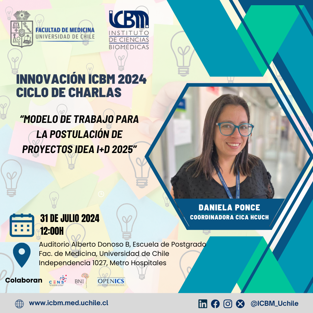 Siguiendo con nuestro ciclo de charlas de innovación, les invitamos este miércoles 31 de julio a las 12hrs en el Auditorio Alberto Donoso B, Escuela de Postgrado, a la presentación de Daniela Ponce, Coordinadora CICA-HCUCH quien nos dictara una charla/taller: Modelo de trabajo para la postulación de proyectos IDeA I+D 2025.
