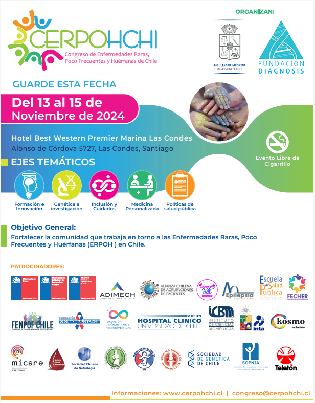 Por primera vez se realizará el “Congreso de Enfermedades Raras, Poco Frecuentes y Huérfanas de Chile”. Esta iniciativa de la Facultad de Medicina de la Universidad de Chile y Fundaciòn Diagnosis se llevará a cabo desde el 13 hasta el 15 de noviembre en el Hotel Best Western Premiere, de la comuna de Las Condes. Este importante evento, tiene como objetivo principal fortalecer a la comunidad que trabaja en torno a las enfermedades raras en nuestro país, abordando temáticas como formación e innovación, genética e investigación; inclusión y cuidados, medicina personalizada y políticas de salud pública.