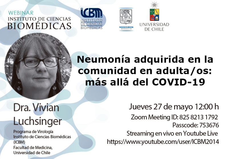Este próximo jueves 27 de mayo desde las 12 horas se llevará a cabo el Webinar ICBM, “Neumonía adquirida en la comunidad en adulta/os: más allá del COVID-19 » y será dictado por la Dra. Vivian Luchsinger.