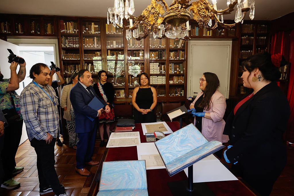 En este entorno, las integrantes del Área de Educación y Mediación Cultural del núcleo patrimonial comienzan a realizar una breve exposición sobre el contexto de la formación de la antigua Biblioteca Central (antecesora del Archivo Central Andrés Bello). Asimismo, se les mostraron distintos materiales que se resguardan, como fue la Aurora de Chile, el borrador de los Sonetos de la muerte de Gabriela Mistral, el ejemplar de El cura civil, texto que habla como el Registro Civil comienza a inscribir los bautizos y matrimonios y su relevancia, entre otros.