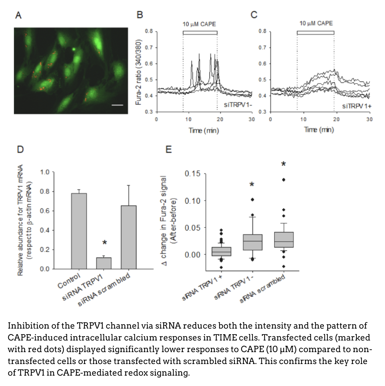 Although CAPE has been widely recognized for its antioxidant, anti-inflammatory, and vasodilatory properties, the molecular pathway responsible for its action in human cells had remained unknown. The study titled "The antioxidant property of CAPE depends on TRPV1 channel activation in microvascular endothelial cells" demonstrated that this compound activates TRPV1, a non-selective cation channel, triggering a rapid influx of calcium ions (Ca²⁺) into the cytoplasm and an almost immediate antioxidant response in microvascular endothelial cells. (DOI: 10.1016/j.redox.2025.103507)