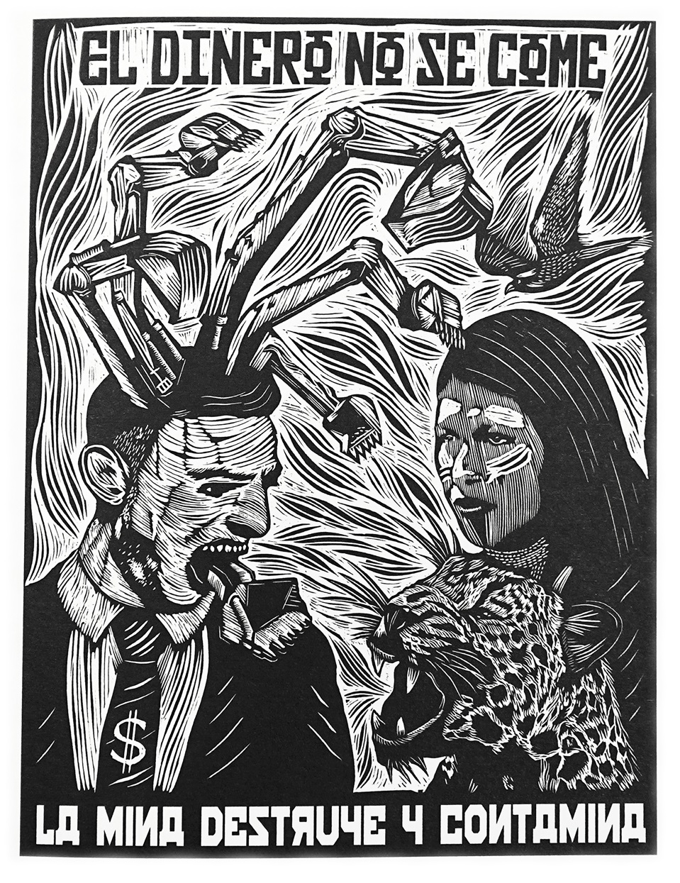 Vlocke, artista y activista mexicano, retrata la violencia minera en su obra "Contamina", aludiendo tanto a la destrucción causada por la actividad minera como a la fuerza que genera la resistencia contra ella.