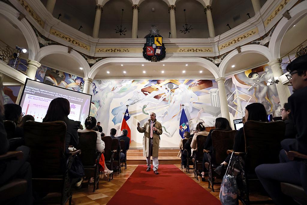 El senador Francisco Chahuán, invitado especial de la jornada, destacó la relevancia de Chile como un puente entre culturas, no solo por su ubicación estratégica, sino también por su compromiso con la apertura comercial y la cooperación internacional. “Un país como Chile se pretende erigir como un puente. Y un puente no es puente mientras no lo crucen los hombres”, dijo citando a Julio Cortázar.