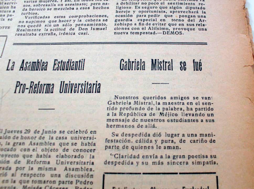 En la revista Claridad, órgano de difusión de la Federación de Estudiantes, el 1 de julio de 1922 se lee: "Nuestros queridos amigos, se va Gabriela Mistral, la maestra en el sentido profundo de la palabra, ha partido a la República de Méjico llevando un mensaje de nuestros estudiantes a sus hermanos de allá. Su despedida dio lugar a una manifestación, cálida y pura, de cariño de parte de quienes le aman. 'Claridad' envía a la gran poetisa su despedida y su más sincera simpatía".