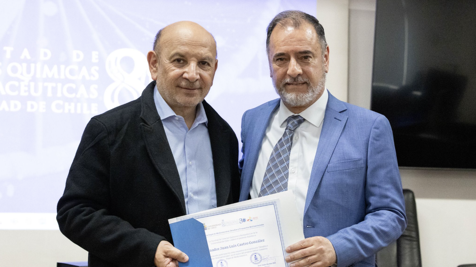 El encargado de dar las palabras iniciales a la actividad fue el decano, profesor Pablo Richter Duk. "La Facultad de Ciencias Químicas y Farmacéuticas desde 2023 está impulsando el Proyecto Hélice, a través del cual generamos alianzas entre academia, sector público y productivo para generar soluciones colaborativas a desafíos del país, como lo abordado en el día de hoy el comercio ilegal de medicamentos. De esta forma, de acuerdo a la misión de la Universidad de Chile, nos ponemos al servicio de la sociedad, integrando diversas miradas para aportar al diagnóstico y construcción de políticas públicas", enfatizó la máxima autoridad de la Facultad.