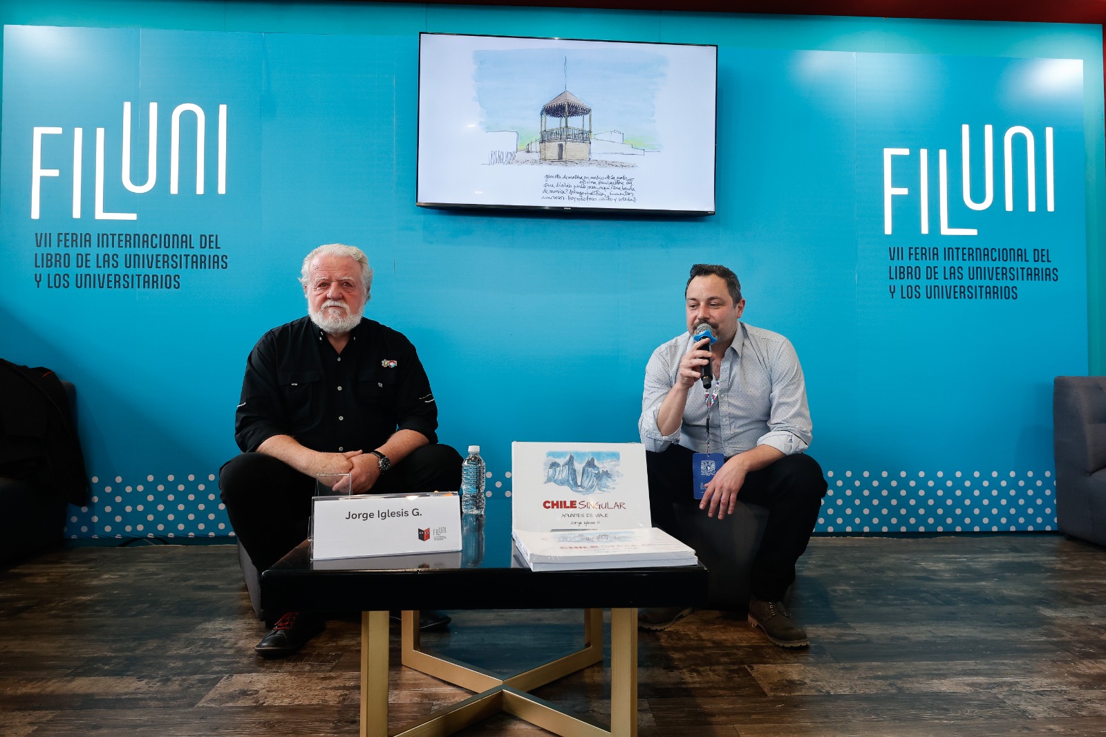 En el mismo horario se realizó la presentación del libro “Chile singular. Apuntes de viaje”, del arquitecto y artista Jorge Iglesis. El libro se compone de acuarelas de los paisajes más asombrosos de Chile y las reflexiones personales que motivaron los viajes realizados para ello. Se incluyen interpretaciones gráficas de lugares como San Pedro de Atacama, Rapa Nui, los ascensores de Valparaíso, Sewell, las Iglesias de Chiloé, el Fuerte Bulnes y Torres del Paine. El profesor estuvo acompañado del coordinador de Publicaciones UCHILE, Vicente Neira.