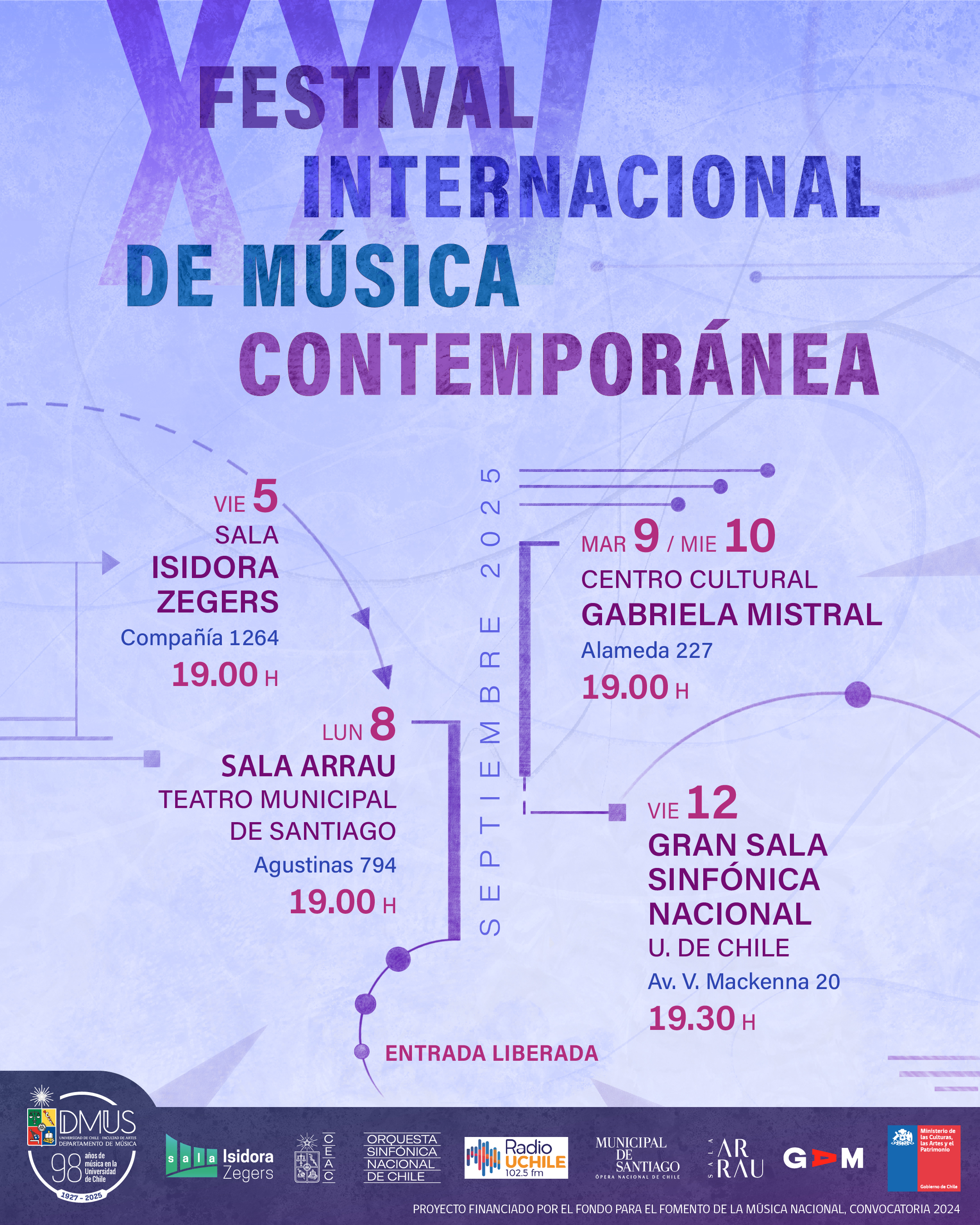 Todas las actividades son con entrada liberada y, en el caso del viernes 12 en el CEAC, se requiere llenar un formulario de inscripción. La programación completa está disponible acá: https://artes.uchile.cl/agenda/231669/xxv-festival-internacional-de-musica-contemporanea