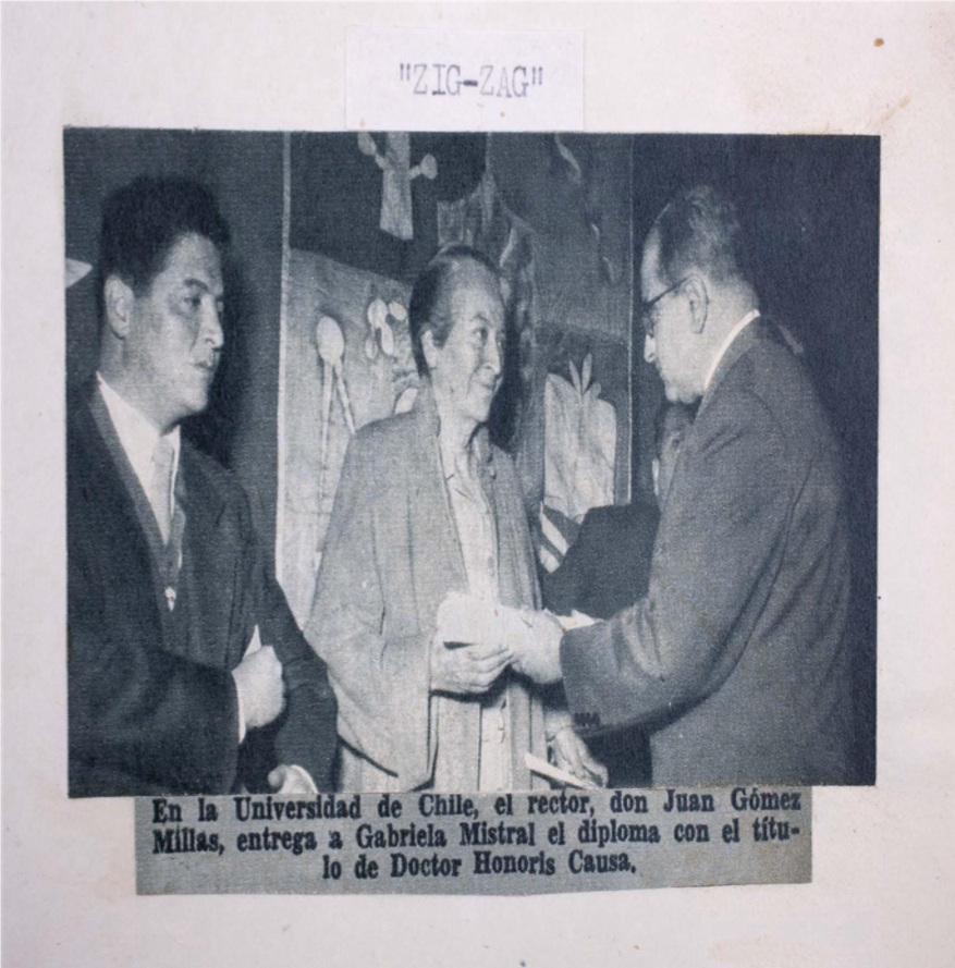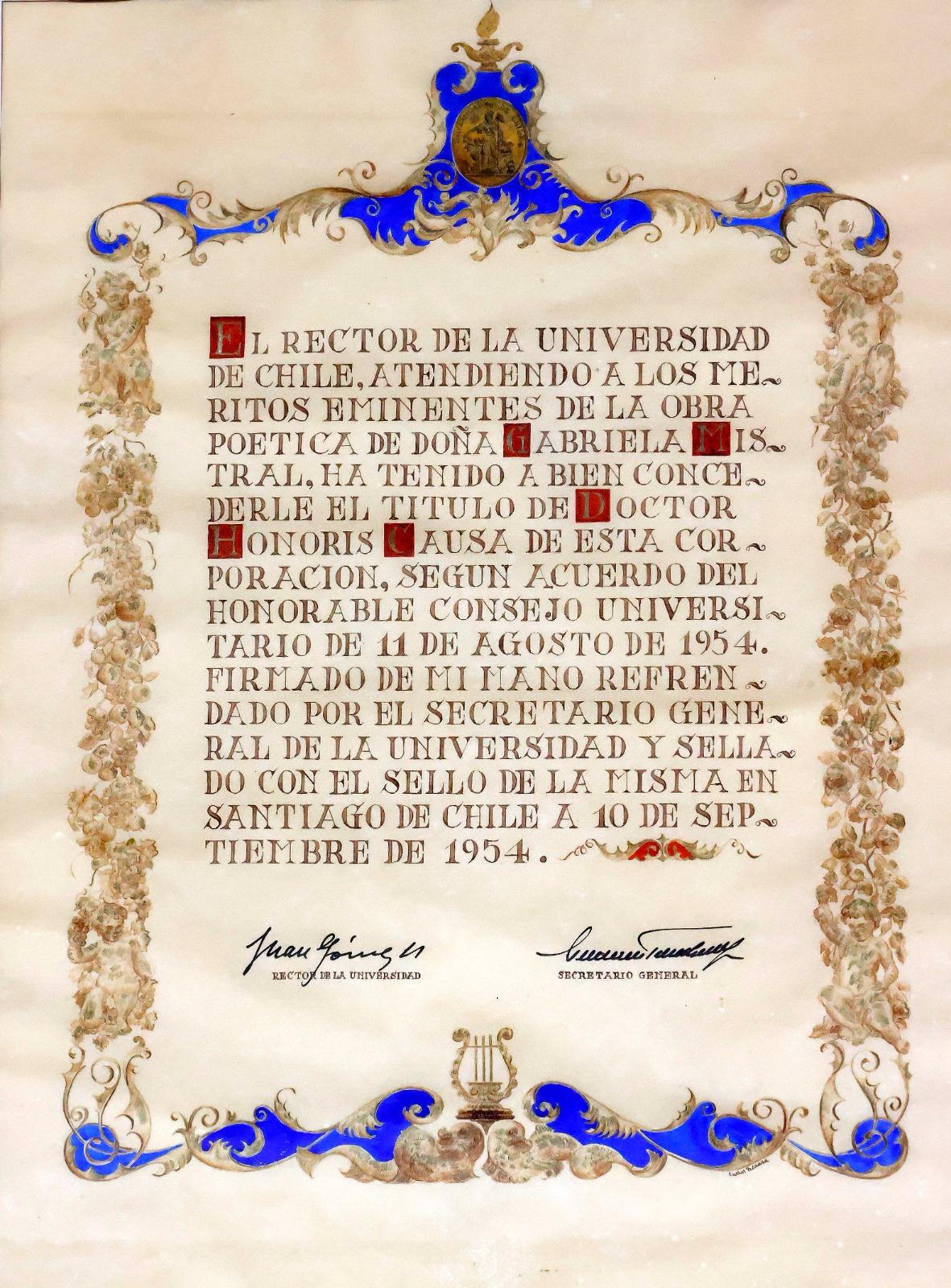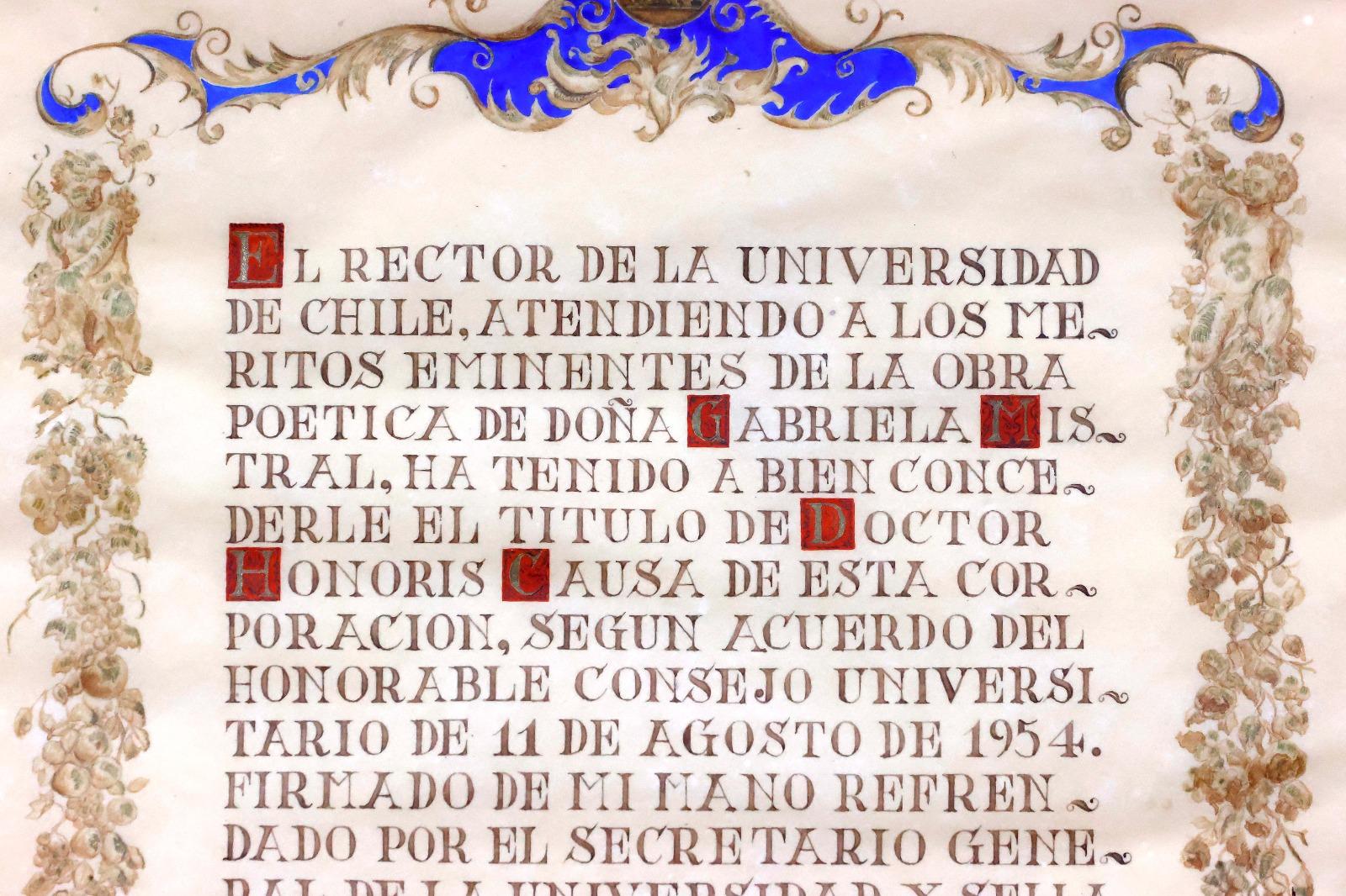 Este hito, la entrega de uno de los máximos reconocimientos académicos de la institución, se constituye en el primero de ellos: el primer Doctor Honoris Causa de la UCHILE fue otorgado a Mistral. El 10 de septiembre de 1954, tras 16 años de ausencia en el país, Mistral recibió este reconocimiento en una ceremonia solemne encabezada por el Rector Juan Gómez Millas, realizada en el Salón de Honor de la Casa Central, que selló su lazo de gratitud y pertenencia con la institución.