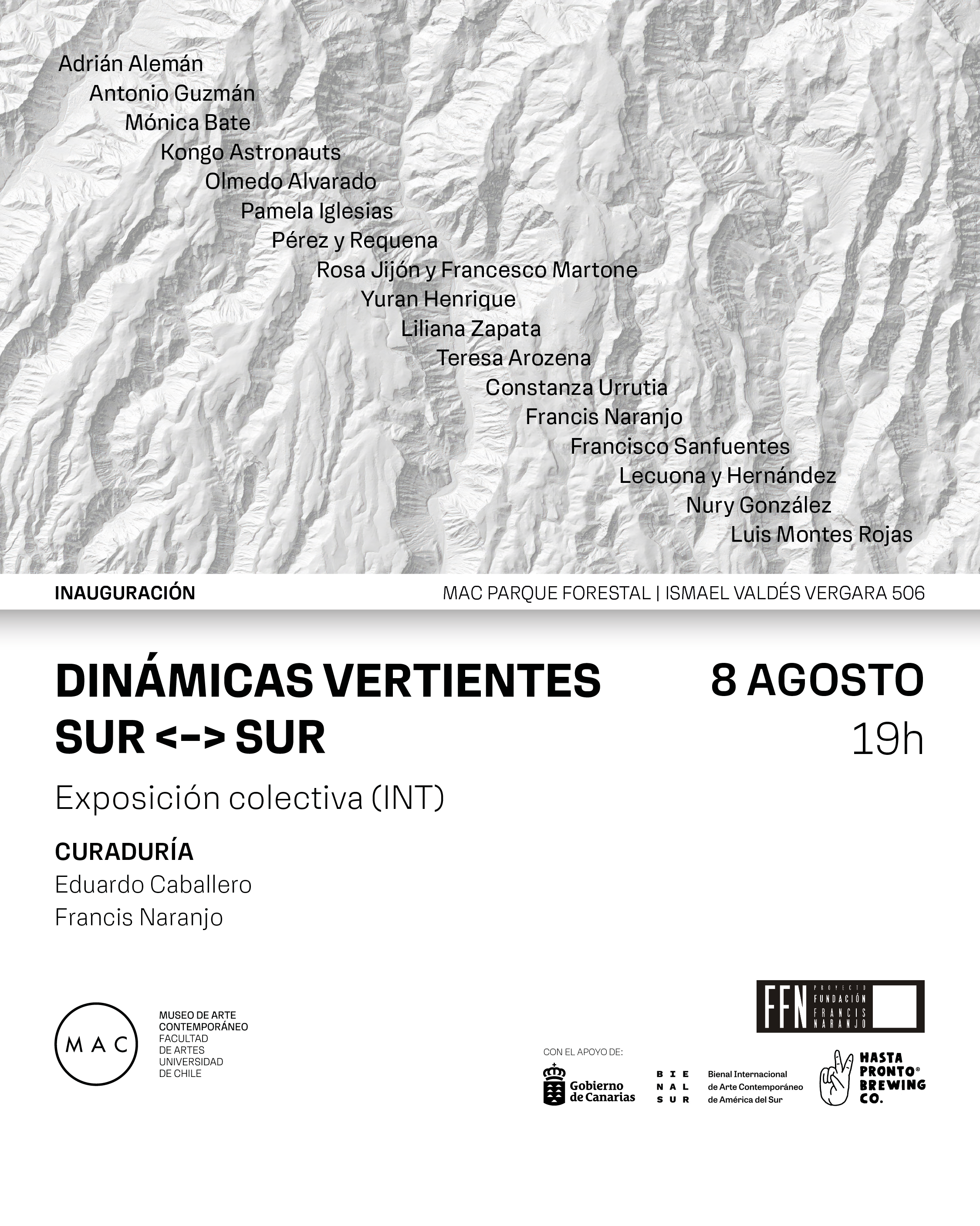 En cuanto a la exposición DINÁMICAS VERTIENTES SUR<->SUR se gestó a partir de un eje académico entre la Universidad de La Laguna (Tenerife) y la Universidad de Chile, invitando además a artistas de África y Ecuador.