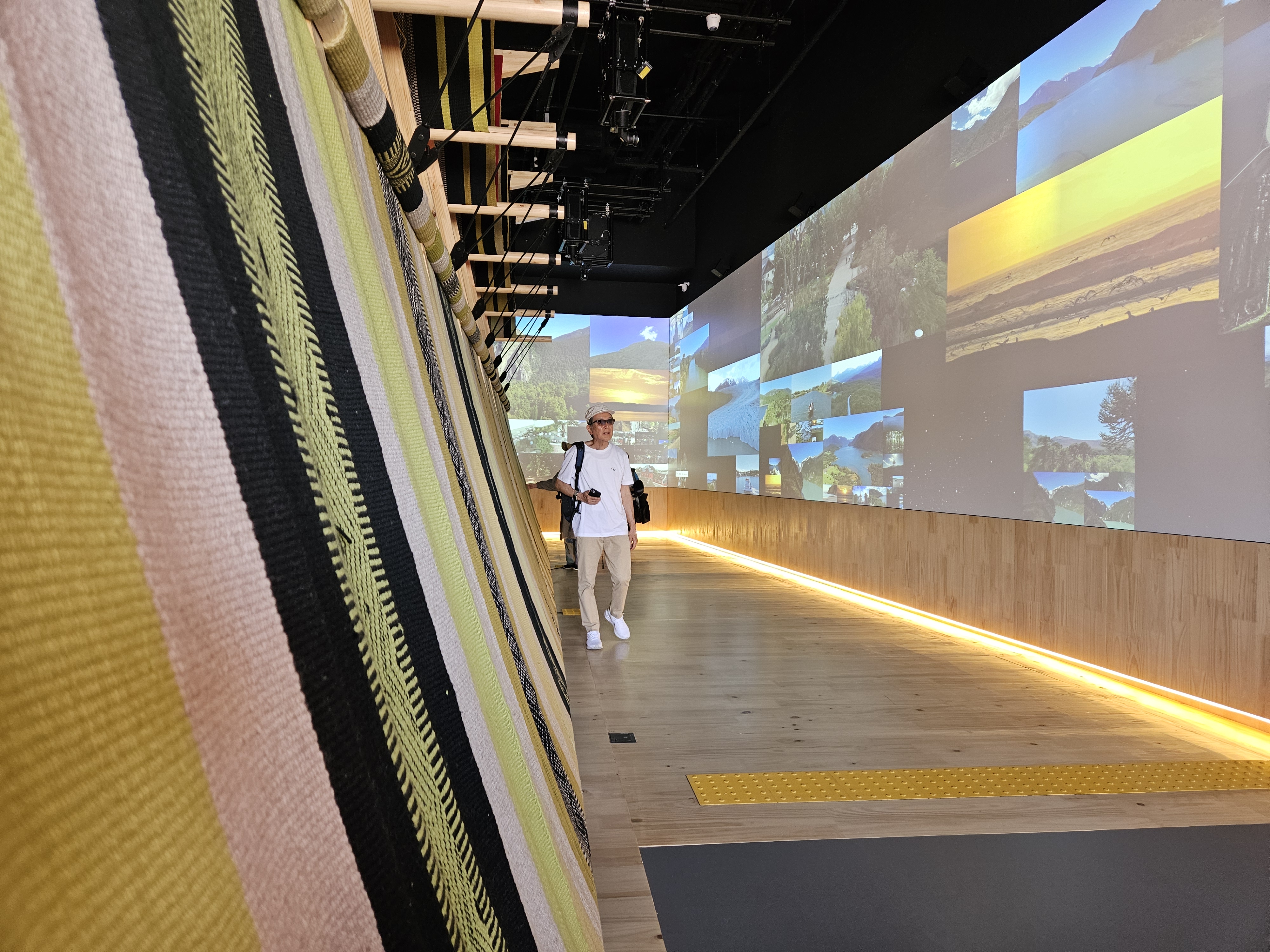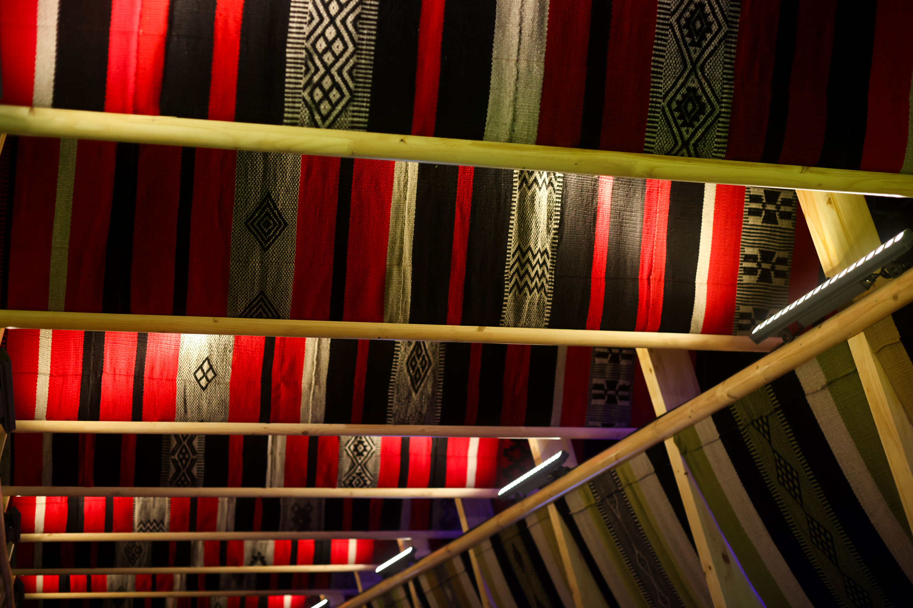 Alrededor de esta estructura, el pabellón se reviste con textiles elaborados por más de 200 artesanos mapuche, inspirados en los colores, materiales y paisajes del sur de Chile. Teñidos con pigmentos naturales obtenidos de plantas, suelos y flora local, los tejidos cumplen una doble función: decorativa y acústica, modulando la luz y el sonido en el interior para crear una atmósfera cálida y envolvente. Los patrones geométricos y los tonos terrosos evocan los mantos tradicionales del pueblo mapuche, proyectando un lenguaje visual que entrelaza naturaleza, cultura y memoria.