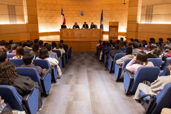 La sesión N°5 se realizó a comienzos de agosto en el Aula Magna de la Facultad de Derecho, con una alta asistencia de estudiantes de pregrado en el marco del inicio de los cursos del área especializada de derechos humanos.