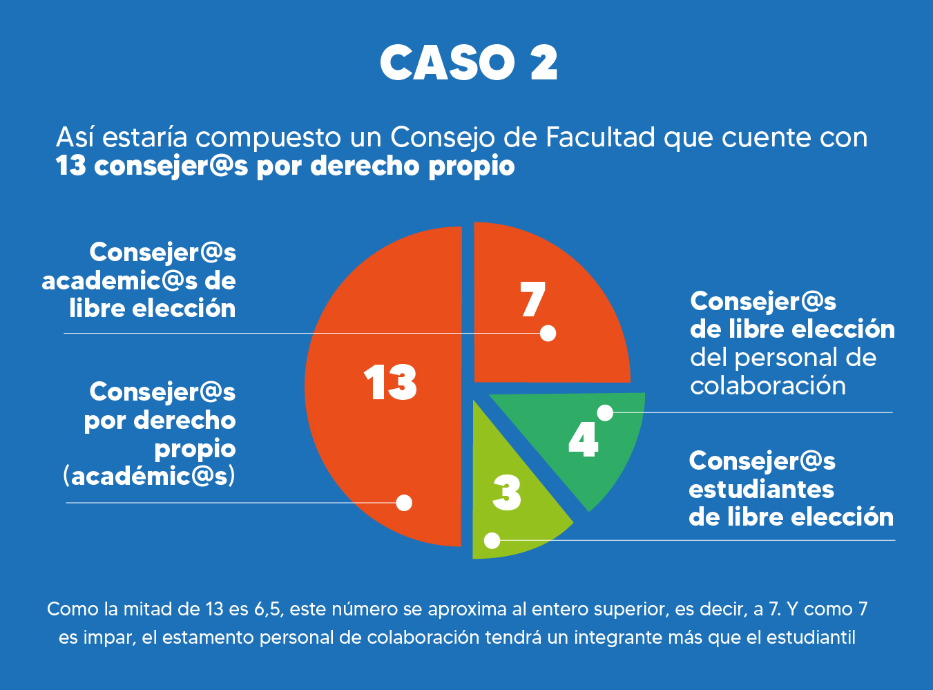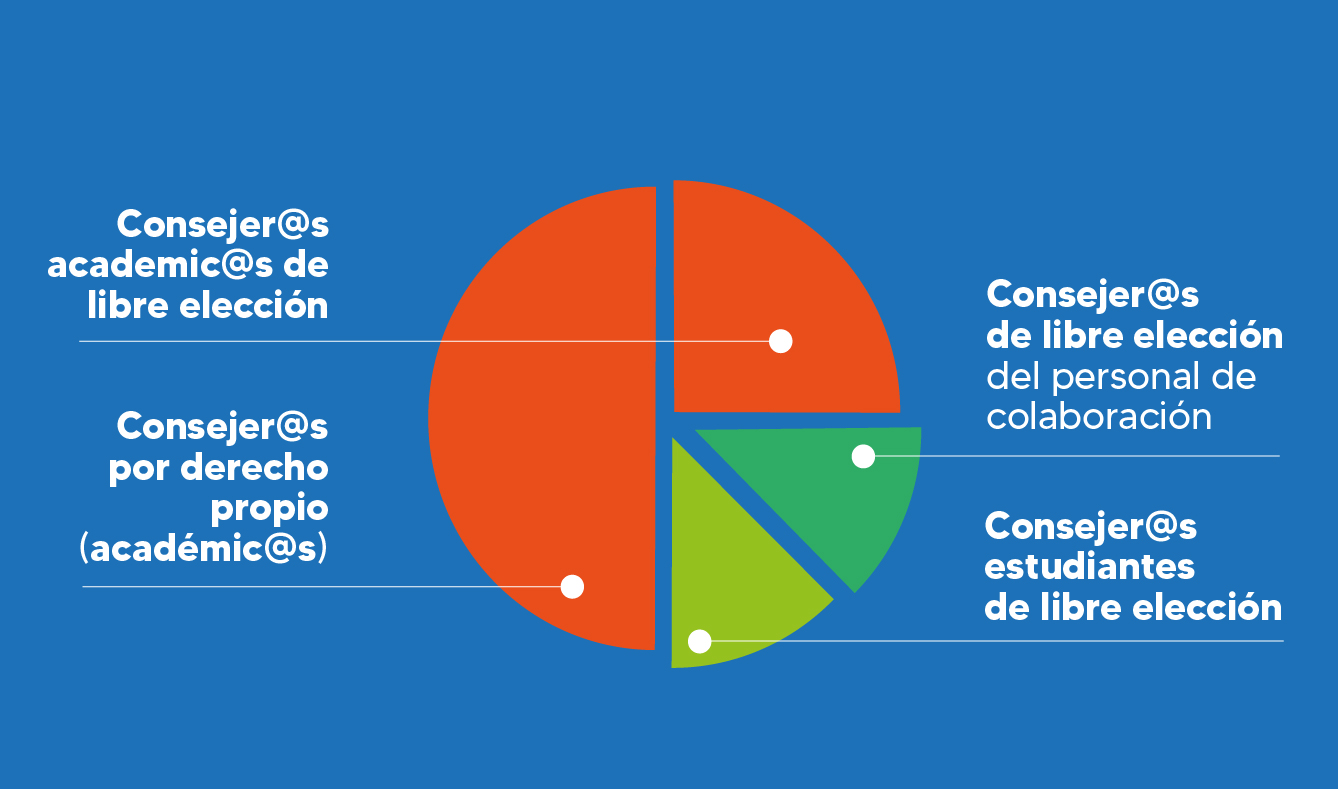 Al respecto, se acordó que la mitad de los/as integrantes de los Consejos de Facultad serán consejeros/as académicos/as por derecho propio, y la otra mitad consejeros/as de libre elección, quienes, a su vez, se compondrán en un 50% por académicos/as, un 25% por estudiantes, y un 25% por representantes del personal de colaboración.